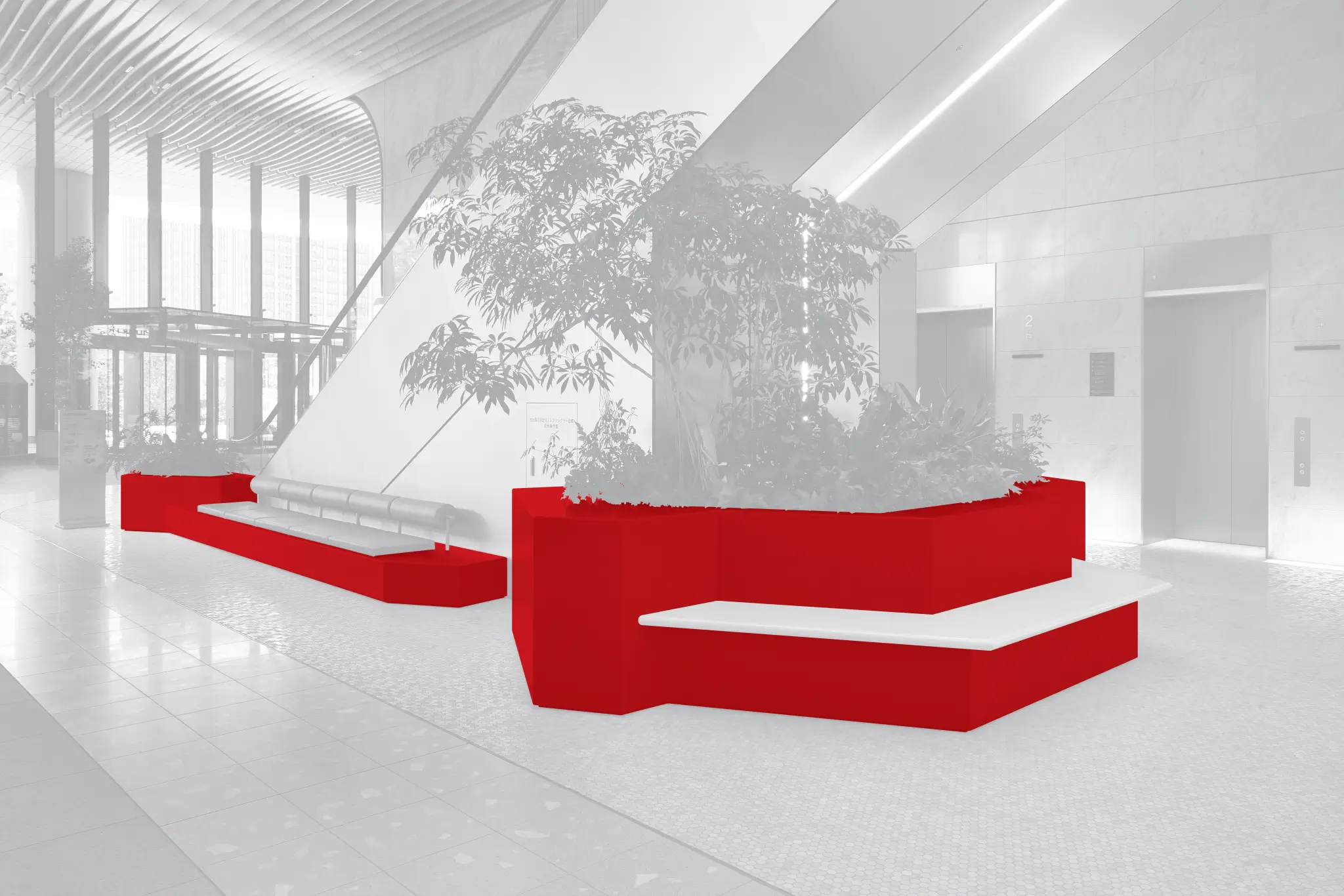 ReCoRi(リコリ)®シリーズを採用したエントランスソファ。通路を広場へと変え、人が自然に立ち止まり滞在できる居場所を生み出している。