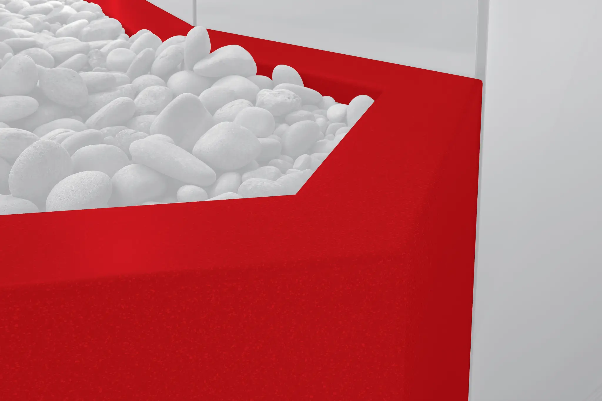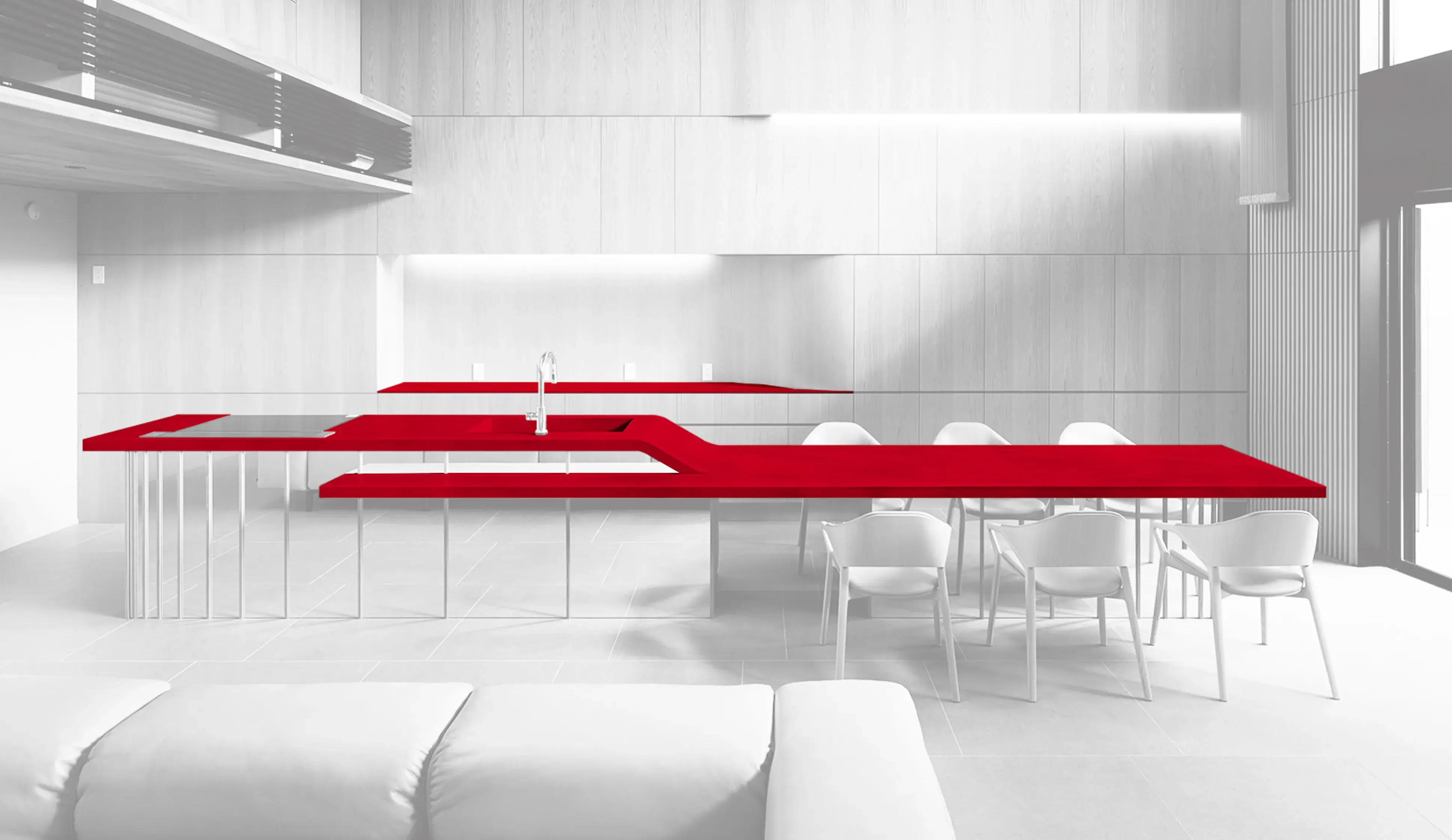 物理特性は従来のコーリアン®と同様の板材。フレキシブルな素材を用いているため、天然石よりはるかに容易に切断や穴開けなどの加工が可能。曲線的なデザインやシームレスな仕上げ、照明とのコラボレーションも。