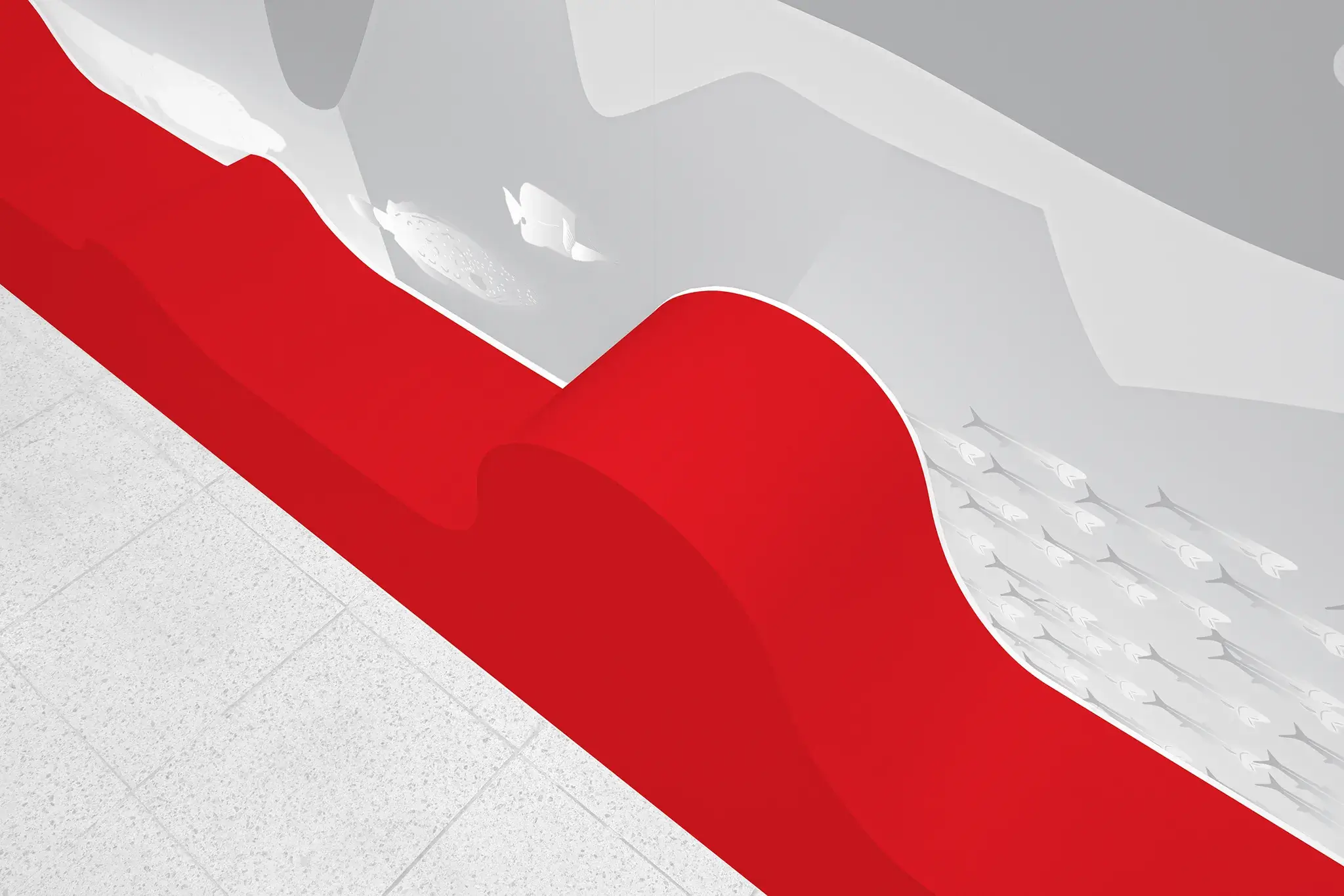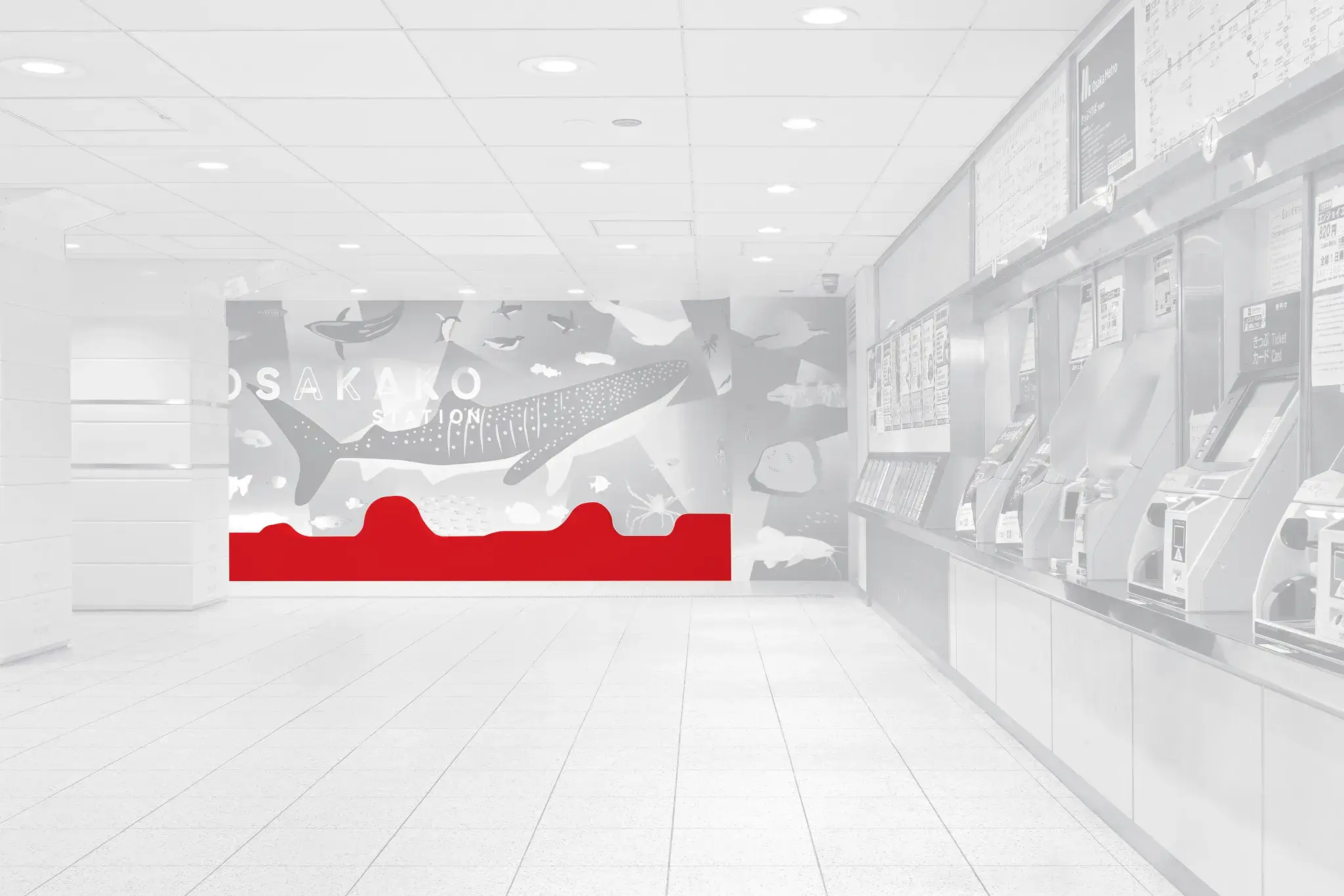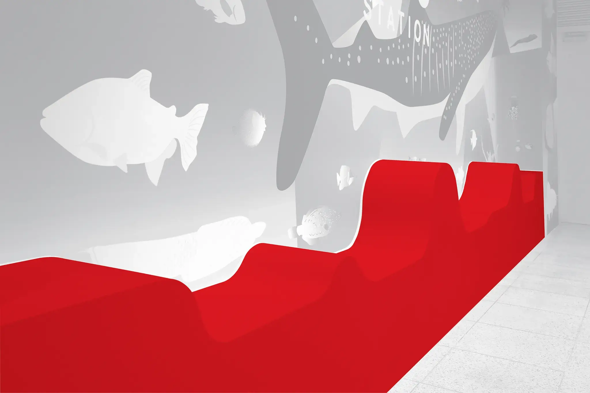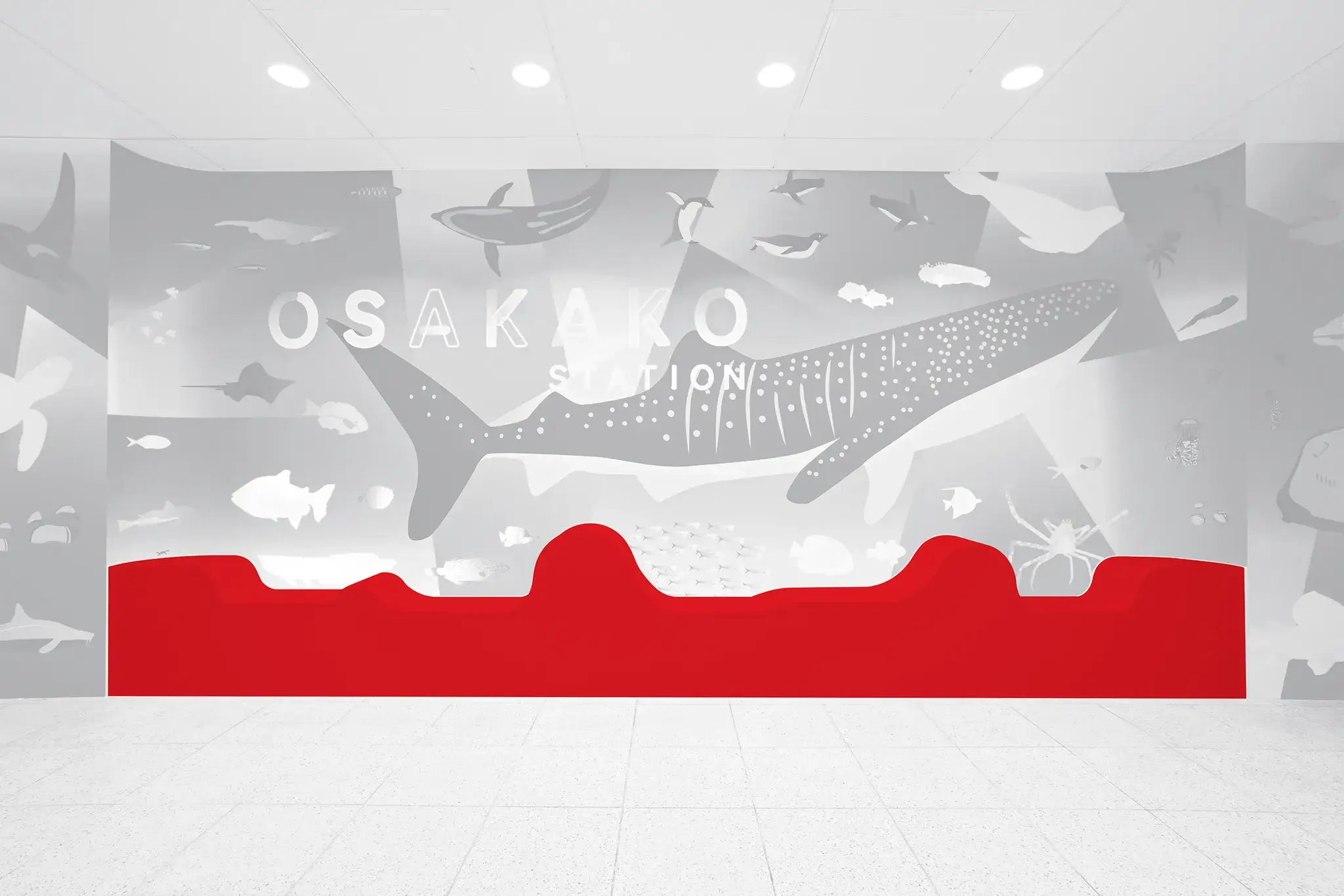 大阪にある世界最大級の水族館「海遊館」の最寄り駅であることから、海底の地形をイメージしてコーリアン®でオブジェを作り、駅構内に人が集まるようなスポットを目指した。