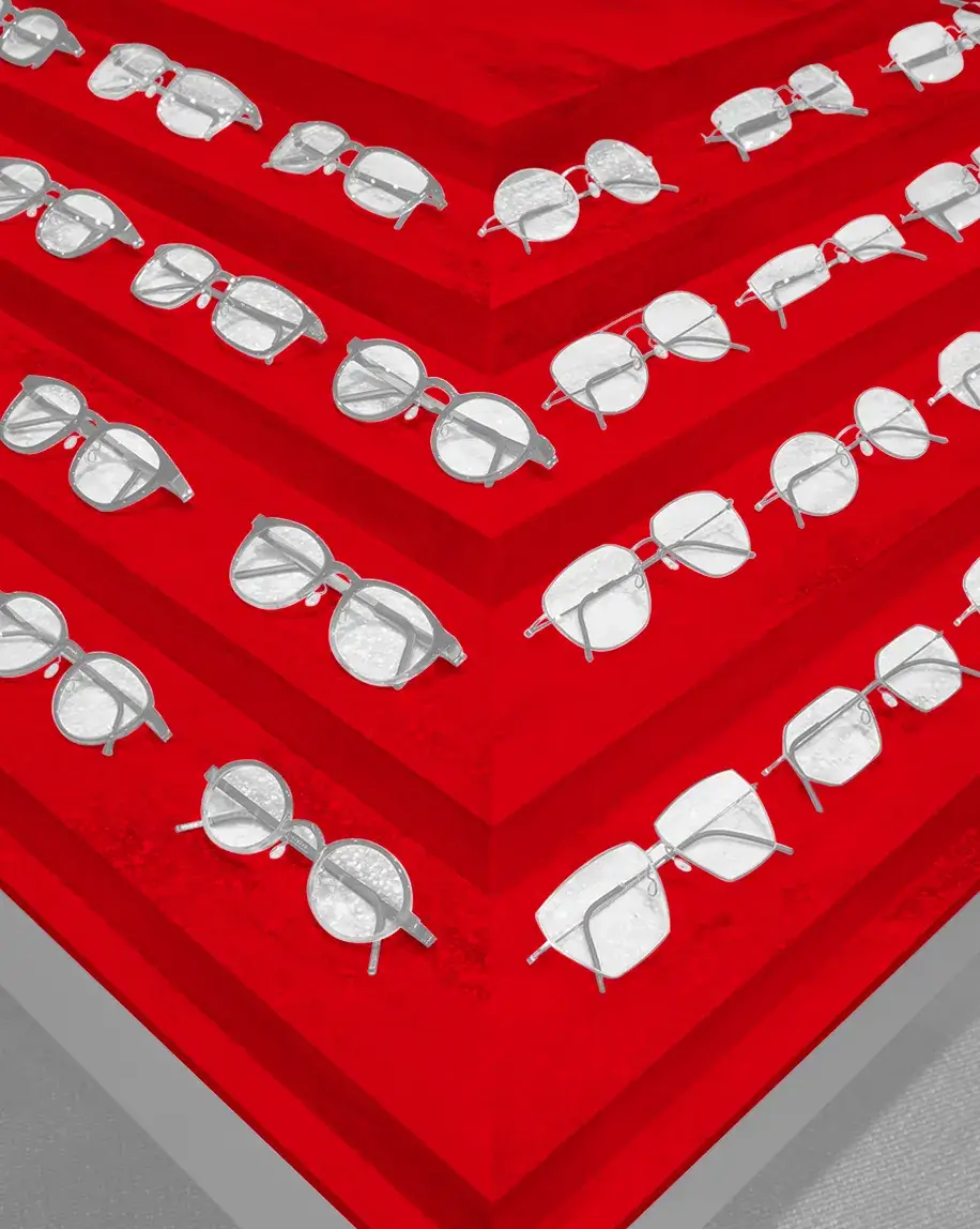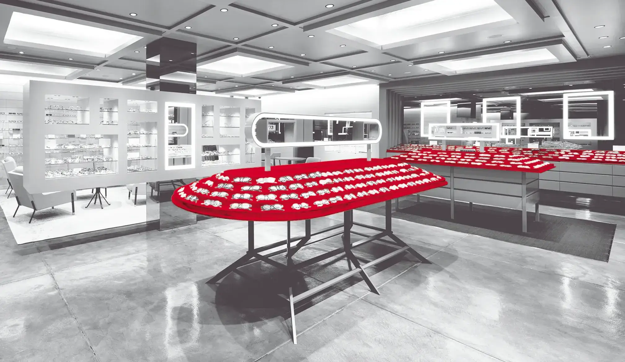 グレーとシルバーを基調としたシックでラグジュアリーな空間で、眼鏡を引き立たせる階段状にデザインされたディスプレイ什器。
