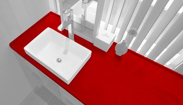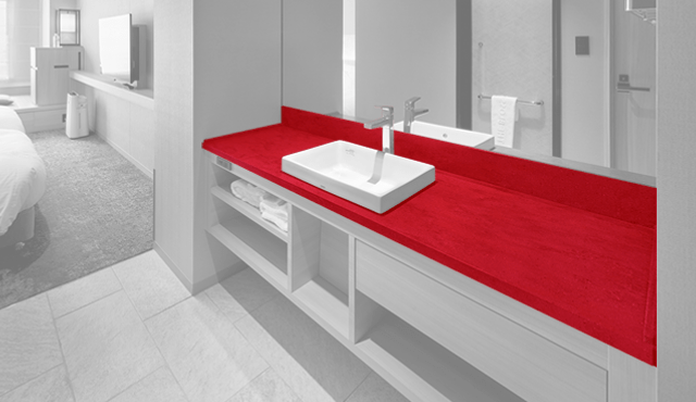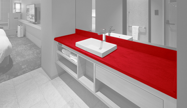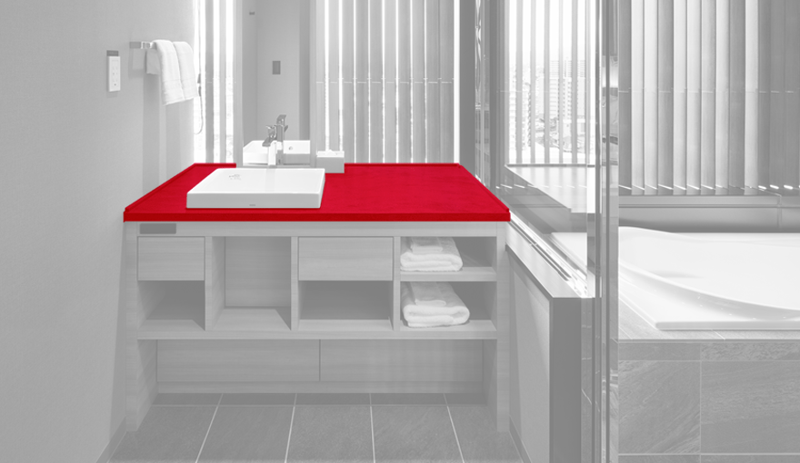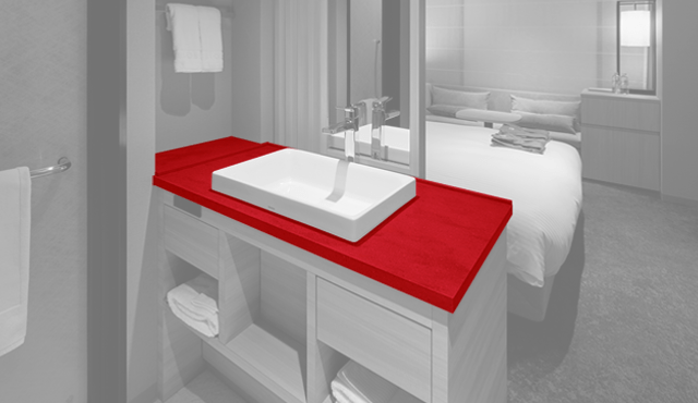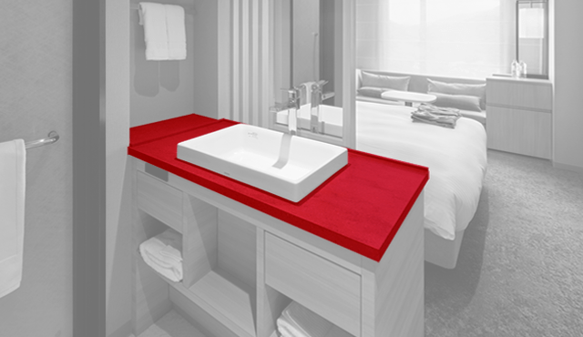 インテリアとの親和性の高いコーリアン®︎、とりわけデザイン性に富む色柄だからこそ、洗面台を客室内のどの位置に配置しても違和感がなく、限られた空間での設計の自由度を高める一助になったのではないだろうか。