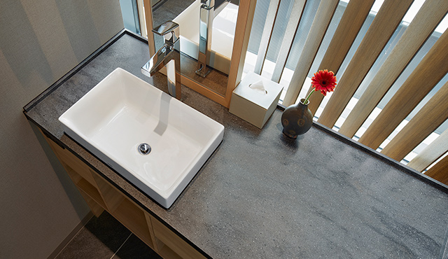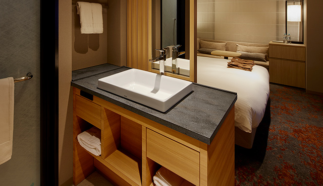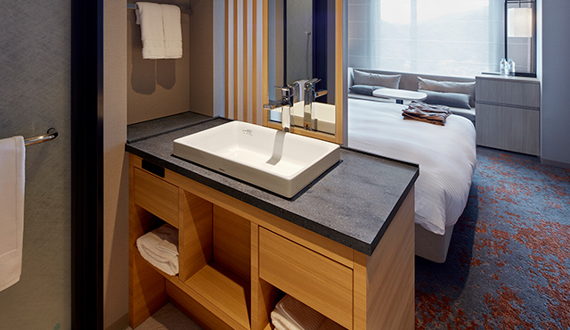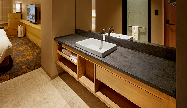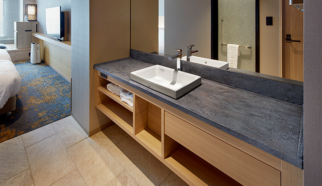 洗面化粧台はハーフベッセルタイプのデザイン。そのカウンタートップにはコーリアン®︎のデュポン™ プライベートコレクション「ラバロックII」が採用されている。グレーの地にアンバーとゴールドの柄を流し、大小のクランチを配した深みのある模様は、キャビネット部分の木目とも相性がよく、モダンでありながら、どこか日本らしさを感じさせる組み合わせ。また、どれも自然界を思わせる色柄の床材や壁材ともよく馴染み、客室に表現されている世界観を、水回りまで揺るぎなく反映させている。