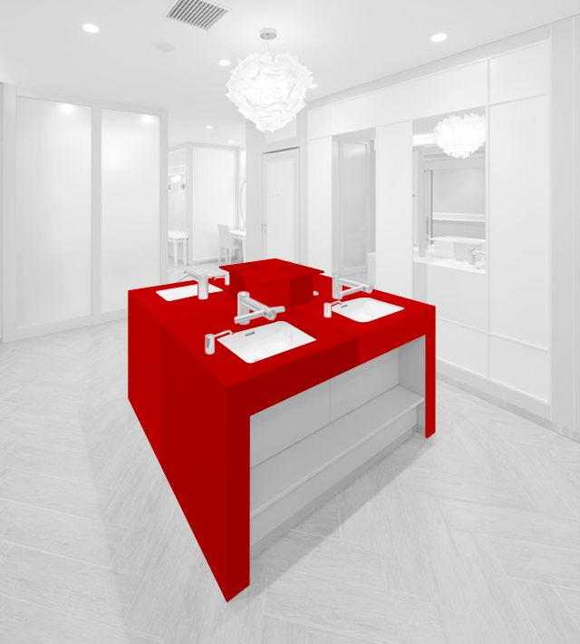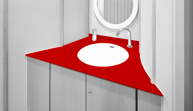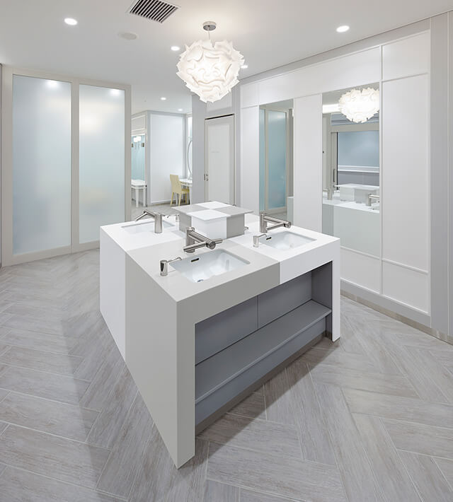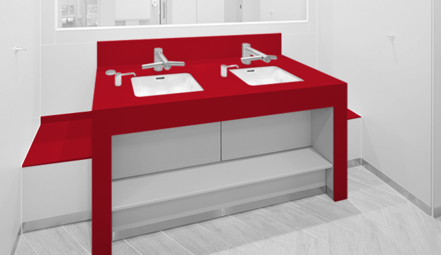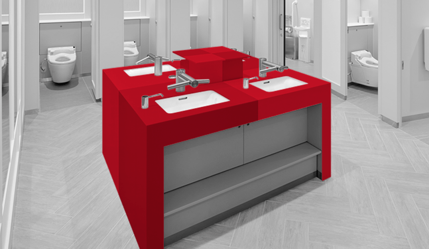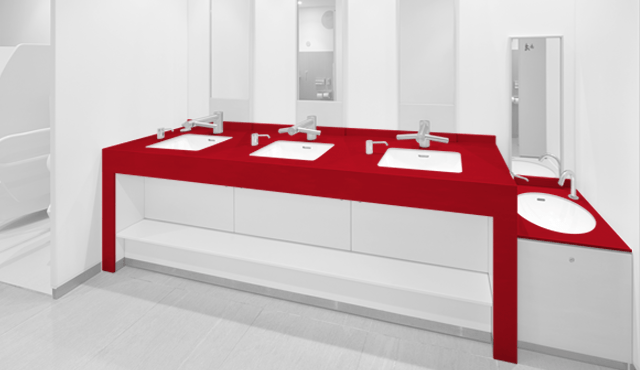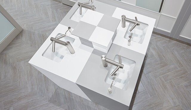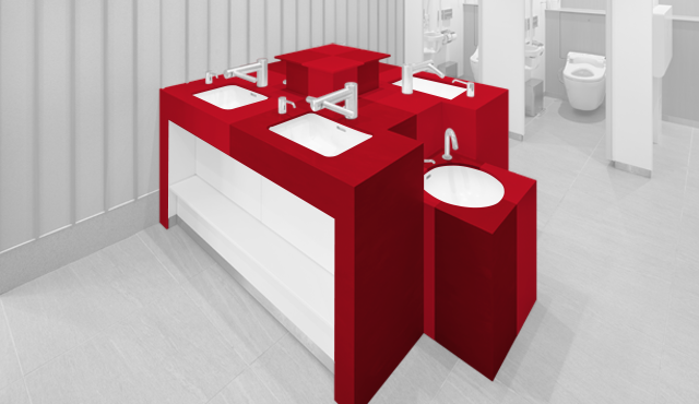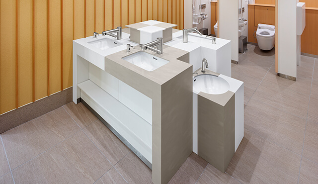 「トイレというのは、1、2m先に必ず壁がある、囲われた空間です。ですから、意識をしなくても素材を身近に感じてしまいます。利用者がその場所に身を置いたときにどのように感じるかに直接関わります。素材や色選びは、空間を演出する大きな要素だと考えています」と小林氏。数ある人工大理石の中でも色数や柄幅の多いコーリアン®でなければ、表現できないデザインがあるという。
