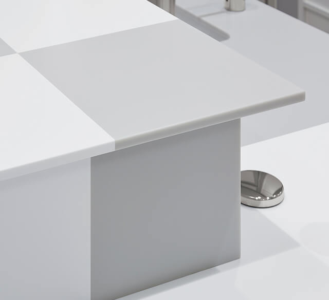 「汚れにくく、手入れも簡単ですから、いつまでもきれいに保つためにはコーリアン®がよいと思います。もし、コストを優先して性能を下げたとしたら、結局は長寿命でなくなってしまいます。また、多くの素材では端部が貼りものになりますが、無垢材であるコーリアン®は私たちが描いたとおりに加工することが可能です。自由な発想でデザインができる素材として手放せません。優しくて丈夫で、これに代わる素材はなかなかないと思います」。