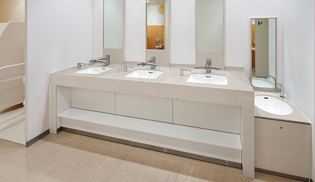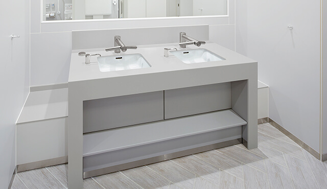 コーリアン®の「グレイシアホワイト」と「パールグレー」を使用。素材に囲まれる空間だからこそ、色柄の選定は繊細だ。シックさを狙った白とグレーの組み合わせが、殺伐さにならないよう、無機質な色の組み合わせでも、ナチュラルさのあるカラーが選ばれた(4階女性用トイレ)。