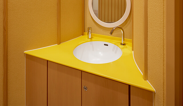 円形の子ども用ブースの間に設けられた手洗いには、コーリアン®「インペリアルイエロー」を使用。