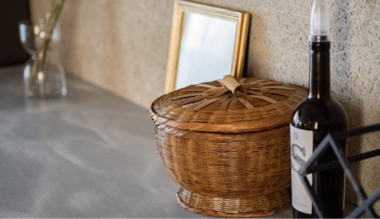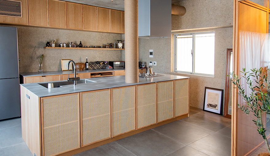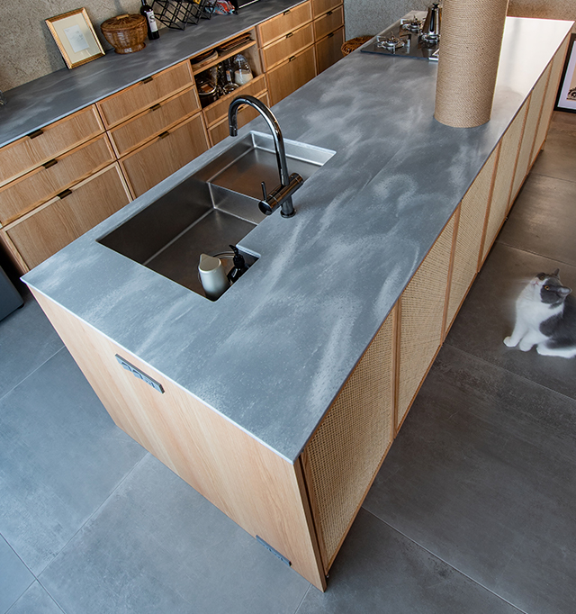 ご紹介する東京都のS氏邸は、マンションをフルリノベーションして2LDKの間取りを開放的なワンルームの住まいに変更。広々とした空間の主役は、料理教室を開いたり、シェフを呼んで友人との会食を楽しむこともできるようにと設計された「人が集うキッチン」だ。食や食器にもこだわりをお持ちのSさんと打ち合わせを重ね、数多く所有されている作家ものの食器がすっきり収まる収納や特注のシンクなど、実用性を備えながら住空間に溶け込むデザイン性も両立。オーク材やラタン、麻縄といった表情豊かな自然素材を使った家具のようなキッチンのワークトップには、グレーのベースにゆらめく白い柄が印象的なカームグレイッシュブルーが選ばれた。