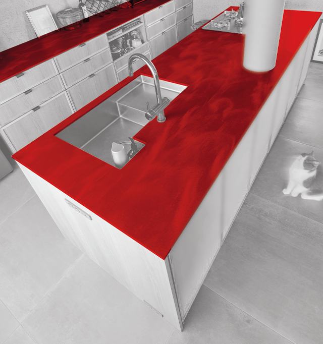 素朴な温かみのある自然素材とも、無機質なコンクリートなどとも相性のよいカームグレイッシュブルーのワークトップ。ほかの素材と同様に豊かな触感を想像させるテクスチャーは、懐かしさもモダンさも漂わせ、人が集うキッチンを居心地のよい空間に演出している。