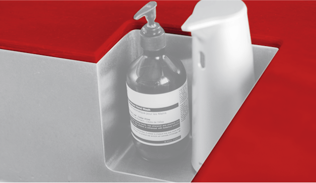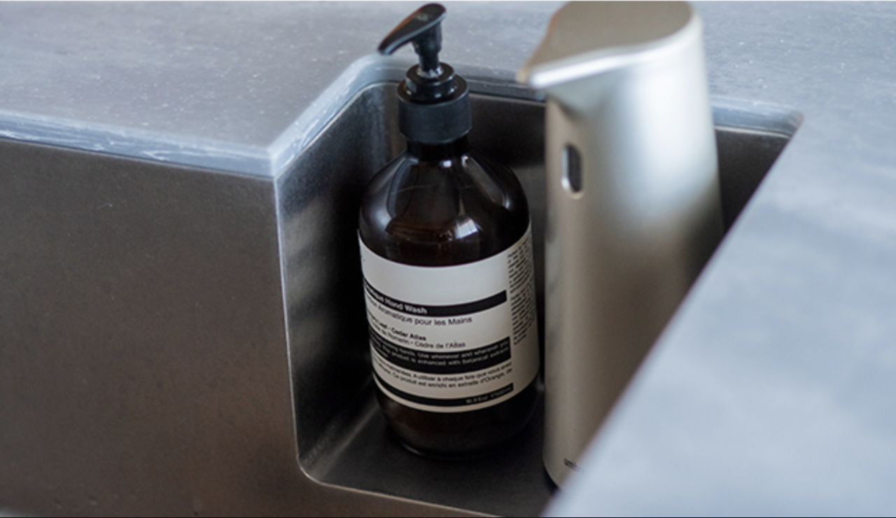 深さが二段になったシンクは、湯切りしたザルを一時的に置くなど調理のしやすさを考えた設計。ソープディスペンサーを置いたくぼみの形状に合わせて