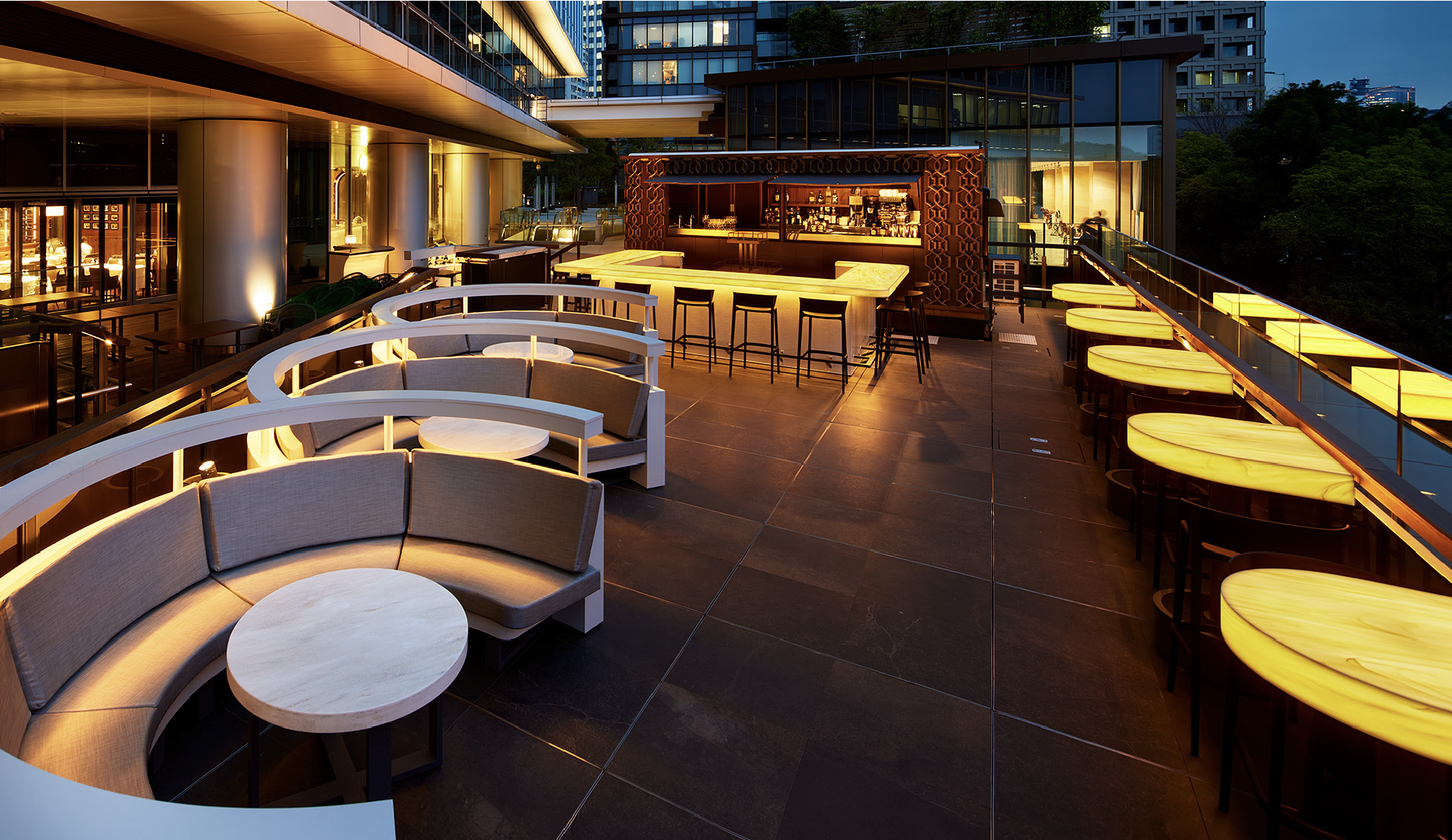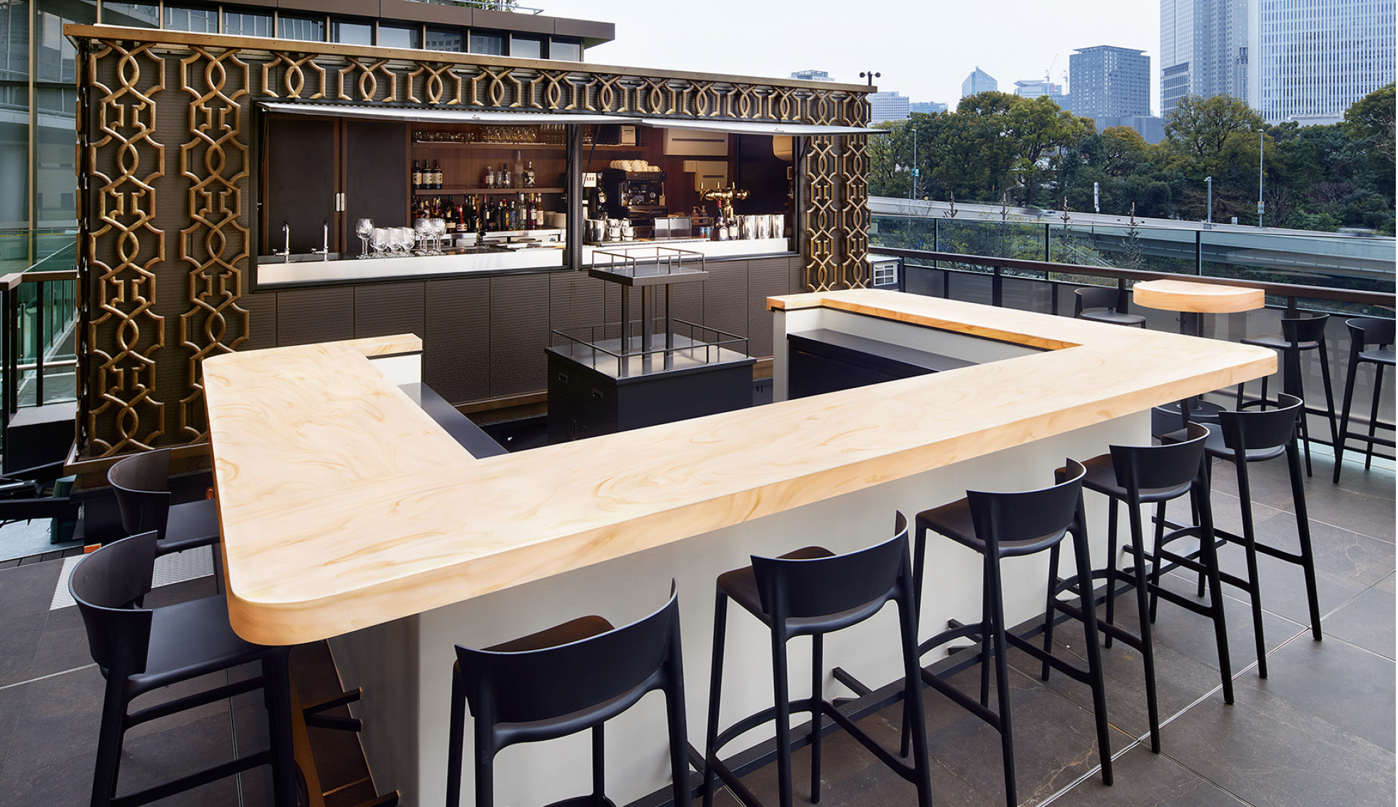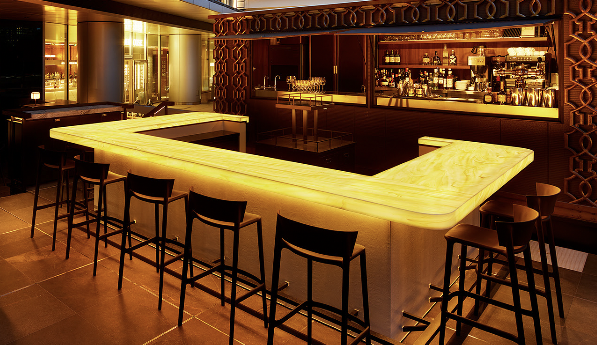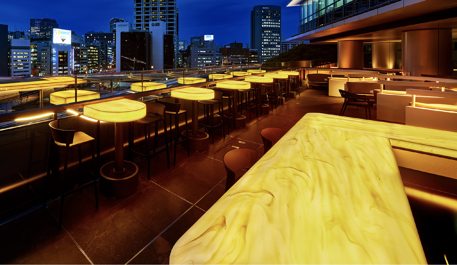 「素晴らしいロケーションを生かして、お客様に海外のルーフトップバーのような雰囲気を感じてもらえる空間にしようと思いました。光の透過によって天板に奥行きのある豊かな表情が生まれ、“ゴールデンオニックス”の模様の陰影が美しく引き立ちます」。テラスラウンジのデザインで意識したのは、高級感を保ちつつも「きらびやか」であることだという板橋氏。