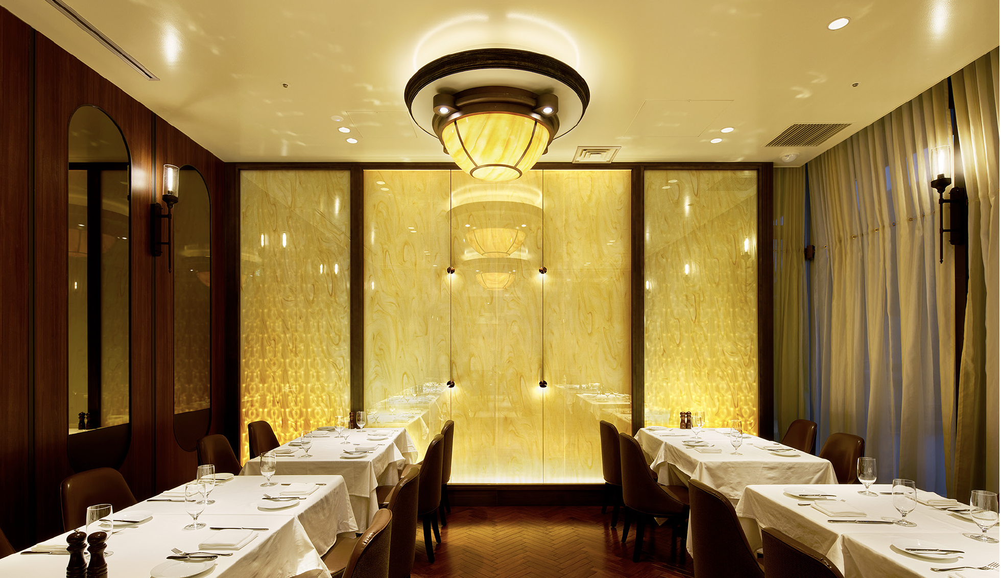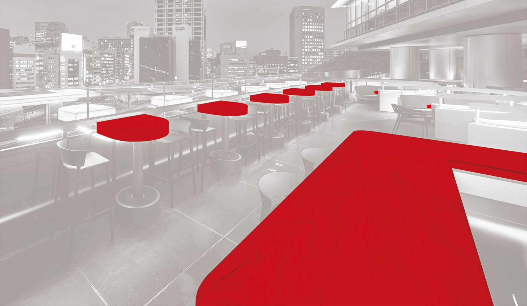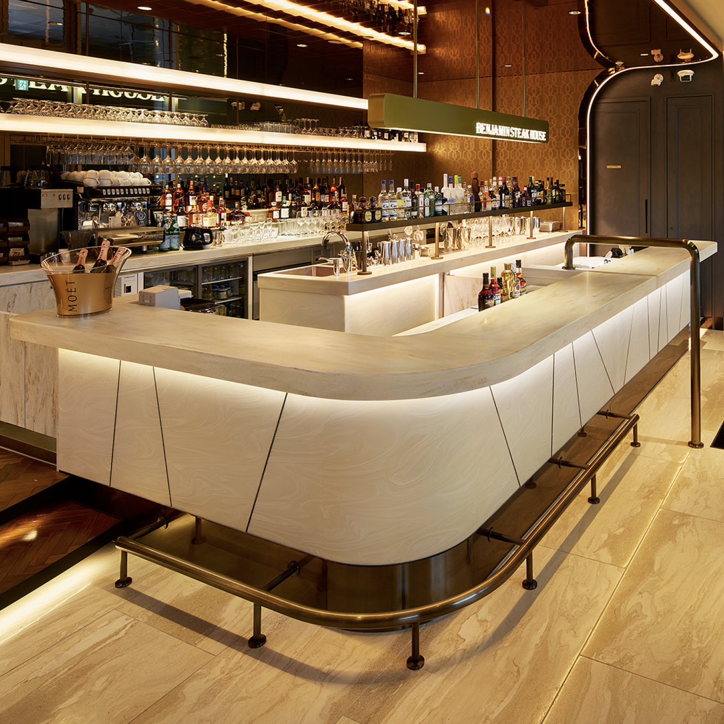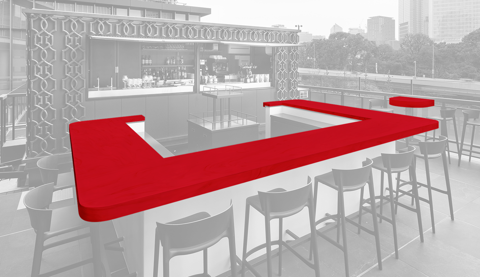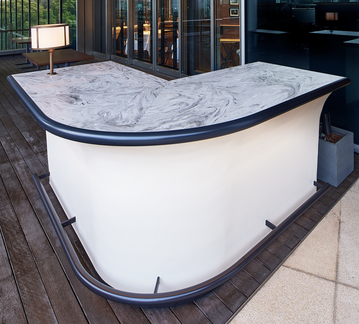 「素晴らしいロケーションを生かして、お客様に海外のルーフトップバーのような雰囲気を感じてもらえる空間にしようと思いました。光の透過によって天板に奥行きのある豊かな表情が生まれ、“ゴールデンオニックス”の模様の陰影が美しく引き立ちます」。テラスラウンジのデザインで意識したのは、高級感を保ちつつも「きらびやか」であることだという板橋氏。
