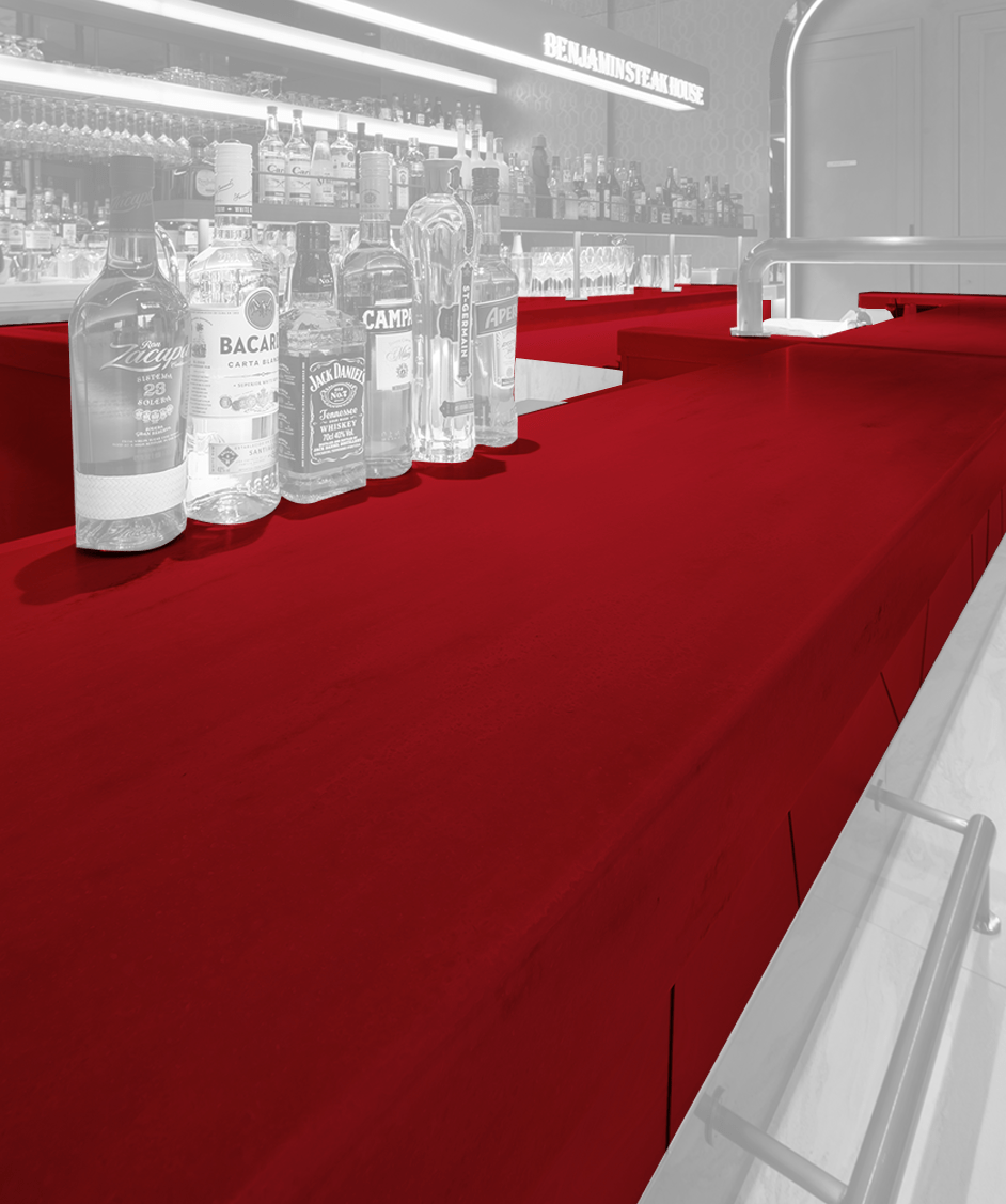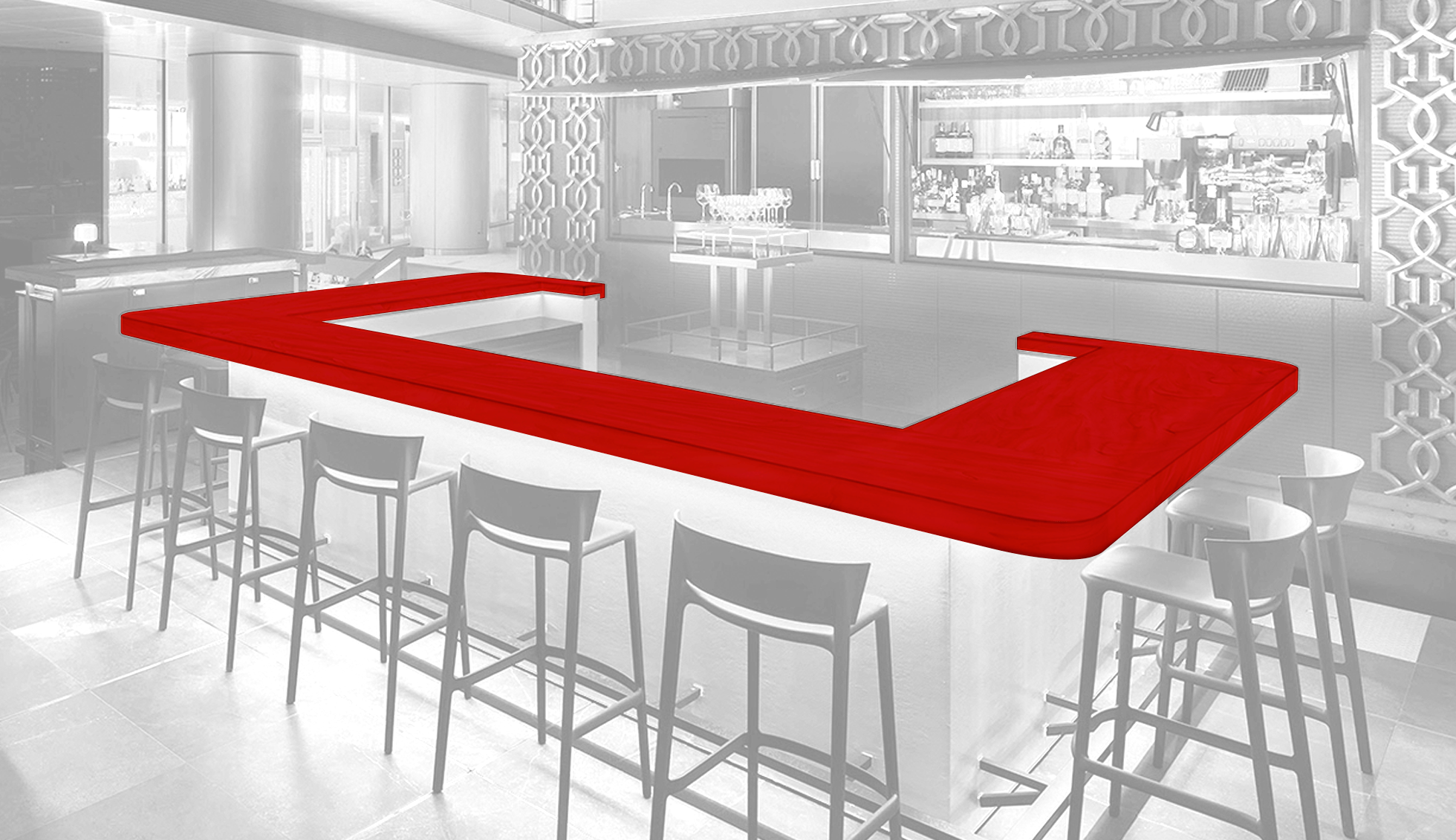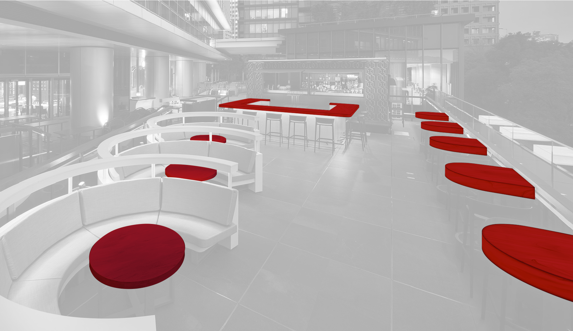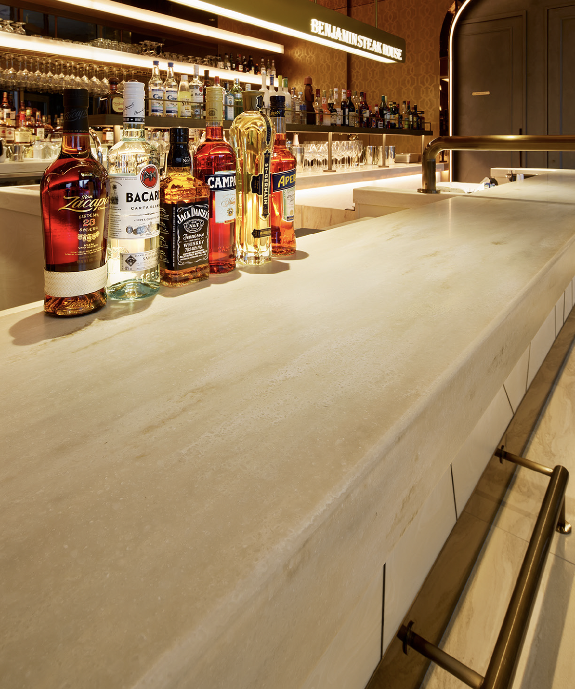 「素晴らしいロケーションを生かして、お客様に海外のルーフトップバーのような雰囲気を感じてもらえる空間にしようと思いました。光の透過によって天板に奥行きのある豊かな表情が生まれ、“ゴールデンオニックス”の模様の陰影が美しく引き立ちます」。テラスラウンジのデザインで意識したのは、高級感を保ちつつも「きらびやか」であることだという板橋氏。