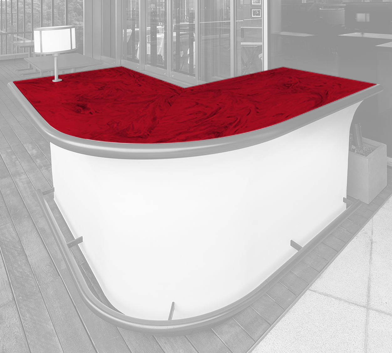 エントランスのレセプションカウンター。側板に入った乱切り調の目地により、店舗全体のデザインに質感を調和させた。天板もシームレスジョイントしたコーリアン®だ。側板と天板の取り合いに間接照明を仕込んだ。