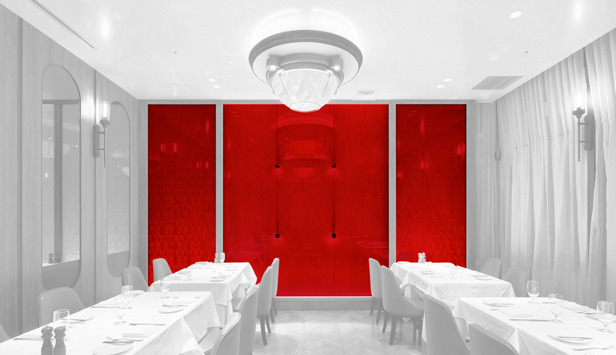 店内に2つあるダイニングホールのうち1室の内観。写真奥の壁面は、裏面をNCルーター加工した