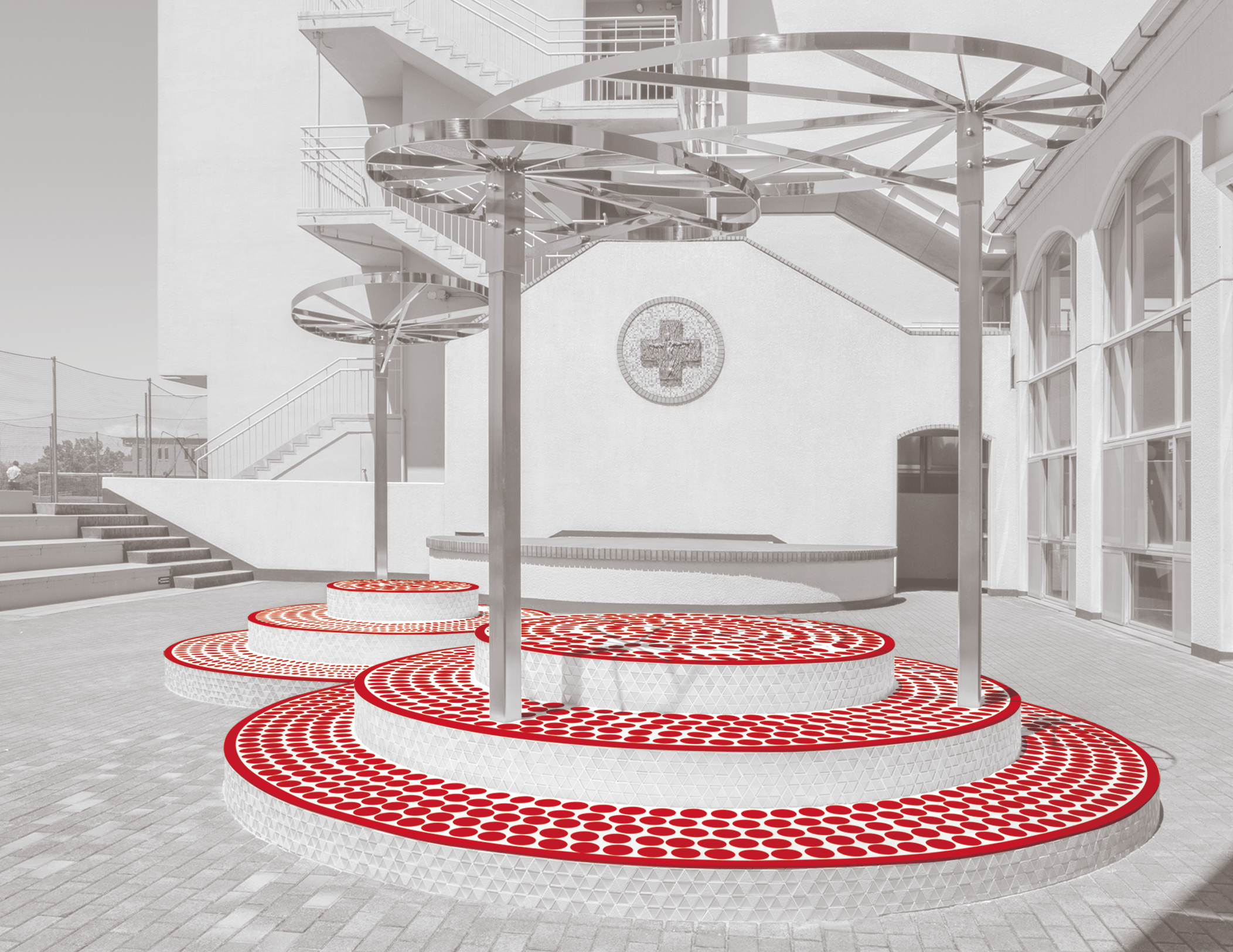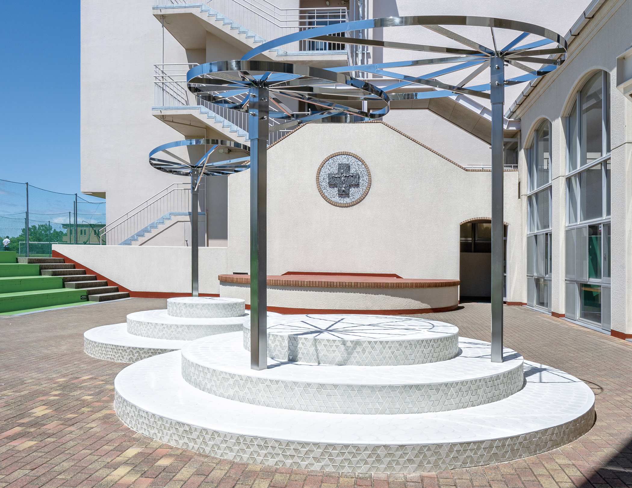 2022年6月、閑静な丘から世界遺産・百舌鳥古墳群を臨む、大阪府堺市のカトリック系学校法人 賢明学院中学高等学校の50期、51期の生徒の卒業記念としてモニュメントが建てられた。波紋のような3段の円形が重なった台座が2つ並び、立木をモチーフとした金属製のパーゴラが目を引く。