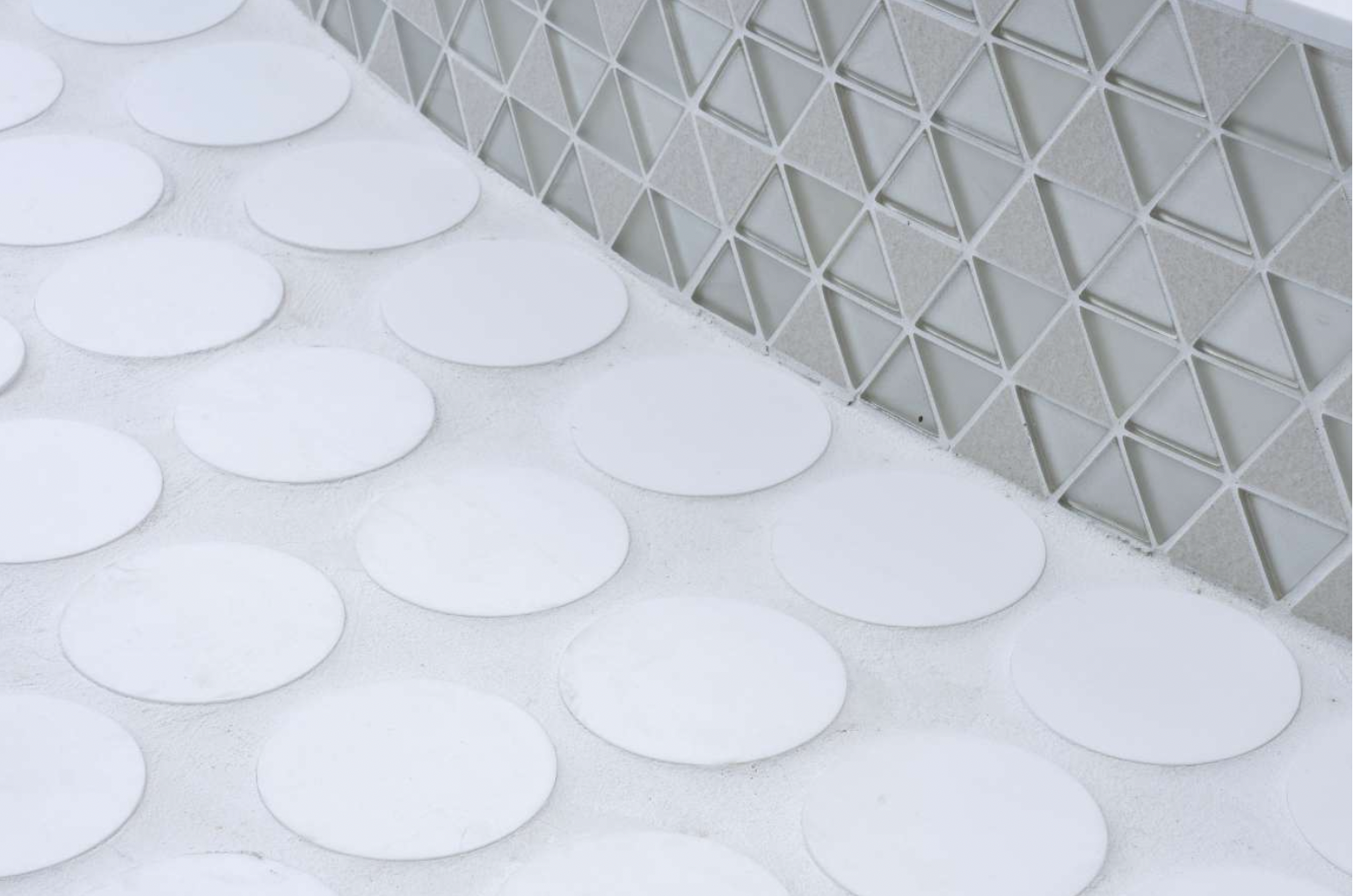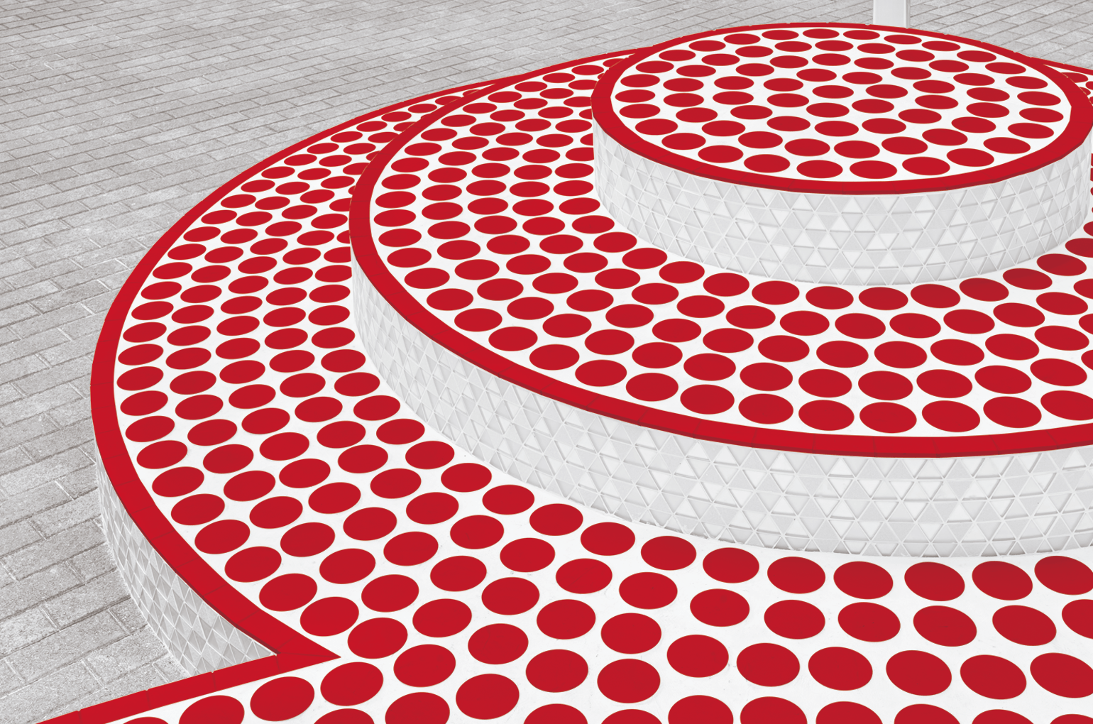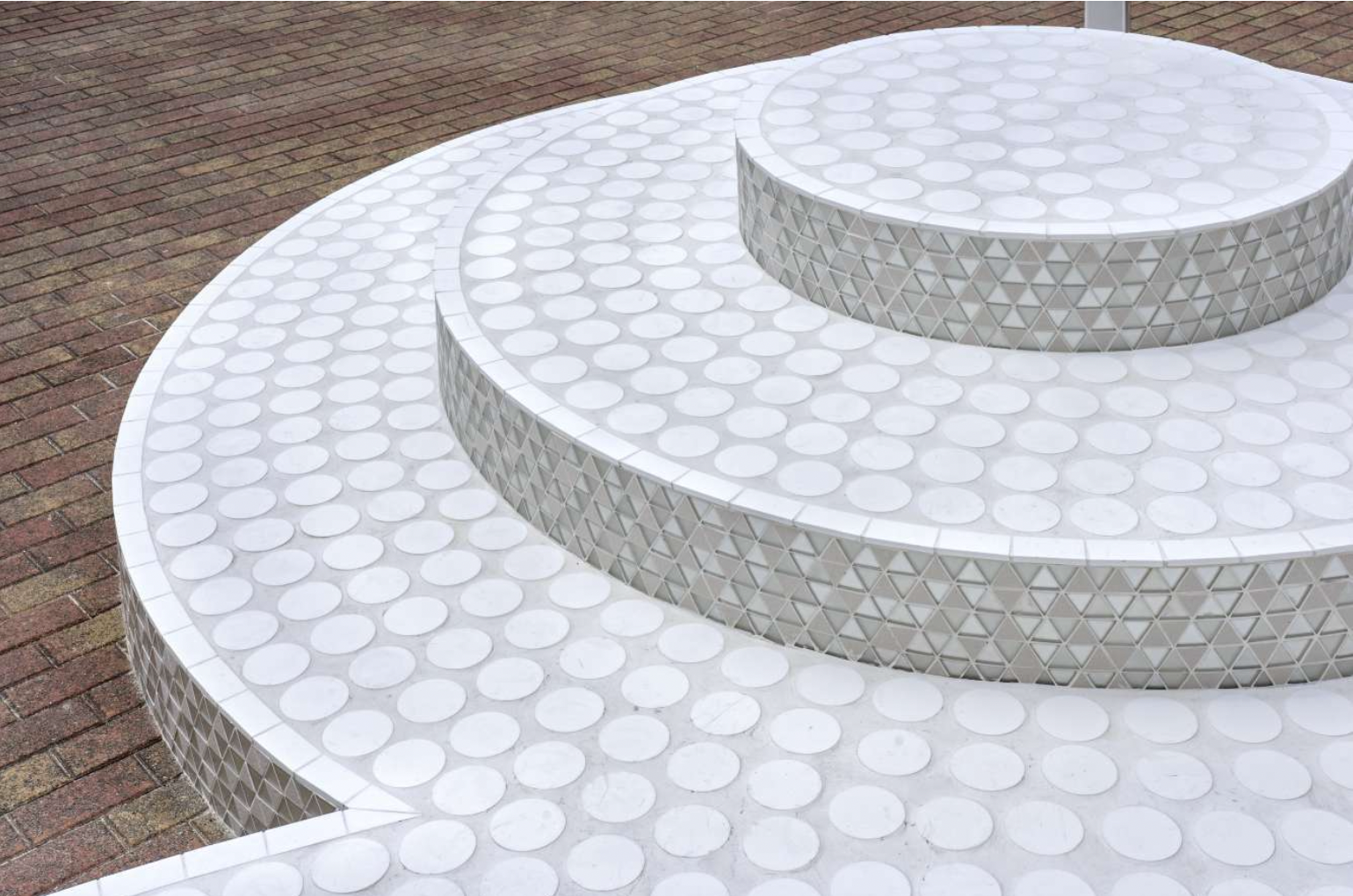 「台座の仕上げ材料として、屋外構造物の床に多く使われる割り石調は、円を描くデザインには向かないとわかっていました。また、焼成タイルにもちょうど良いものがなかった。そこで