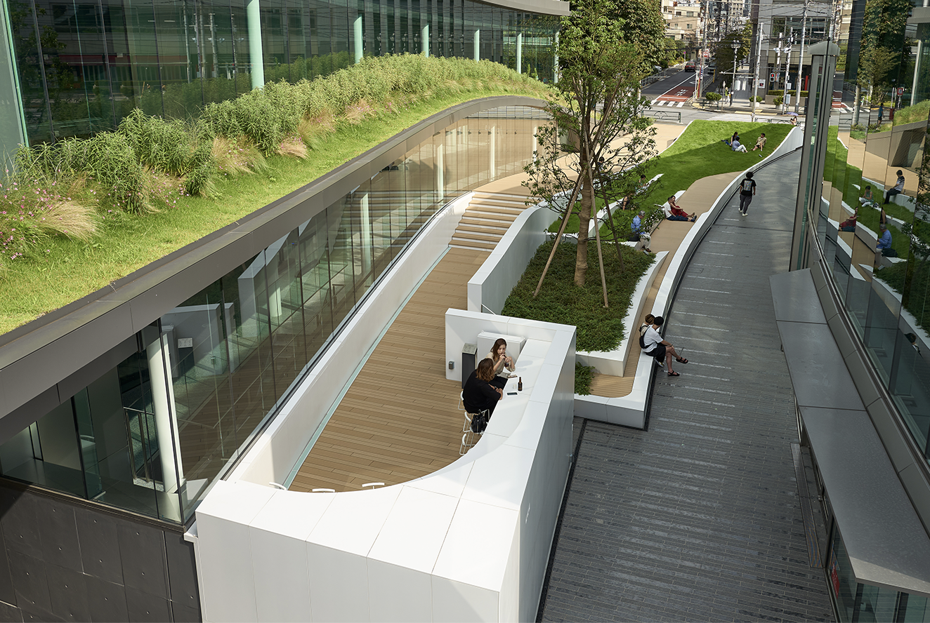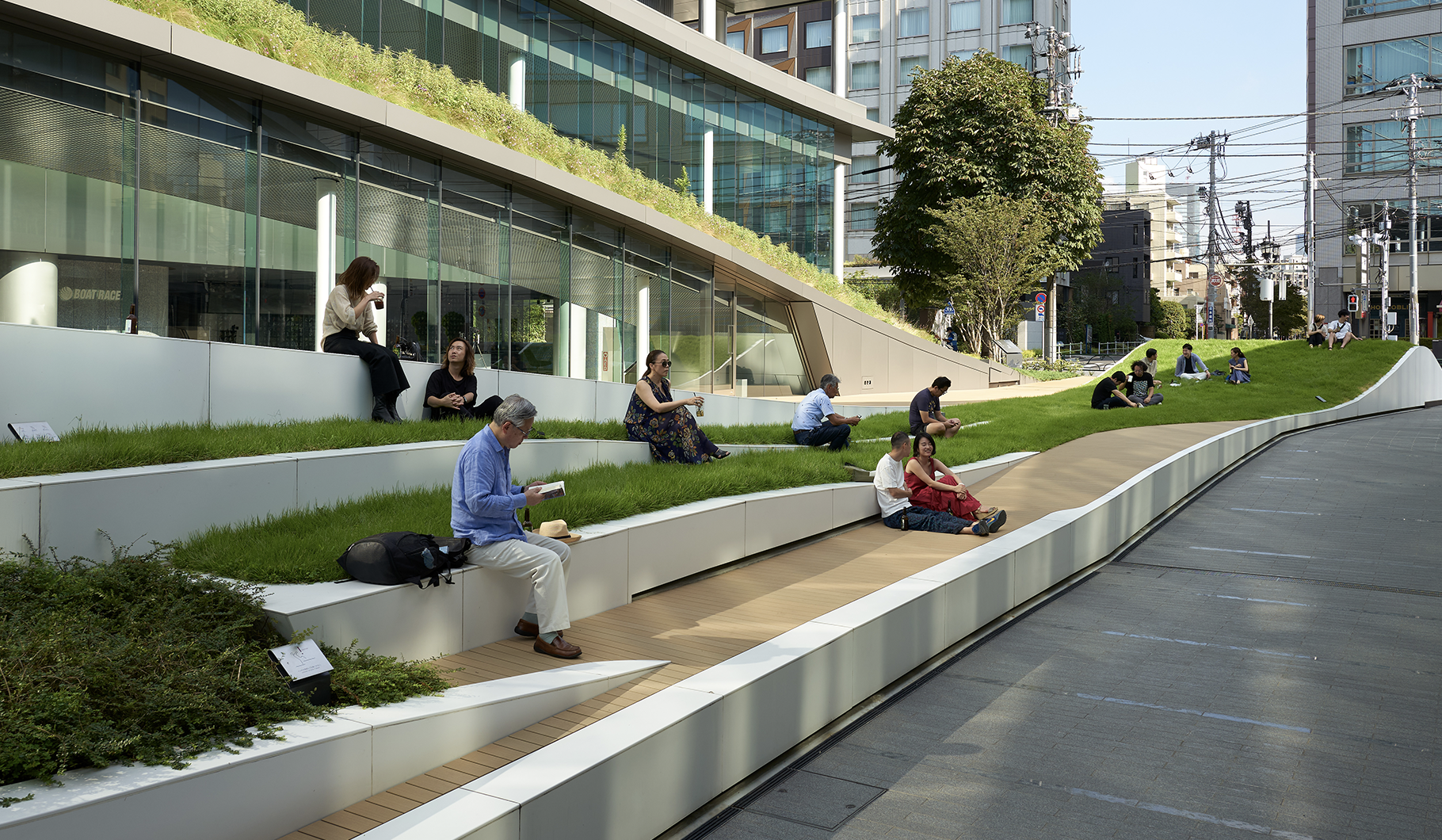 六本木交差点を飯倉方面へ向かって外苑東通り沿いに歩くと、ビル群の合間に突然視界が開け、波の動きを象った、高低差のある白壁と共に芝生+ウッドデッキの広場が現れる。ここは2020年に完成した一般財団法人BOATRACE振興会の複合施設『SIX WAKE ROPPONGI』だ。オフィス棟とホール棟の間に憩いのスポットとして屋外広場『SIX WAKE GARDEN』が設けられ、ガラス張りの壁が湾曲するビルの外観とも呼応して、都心に自然豊かな景観を創り出している。