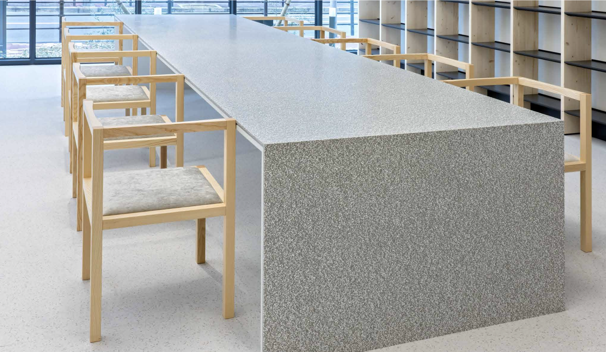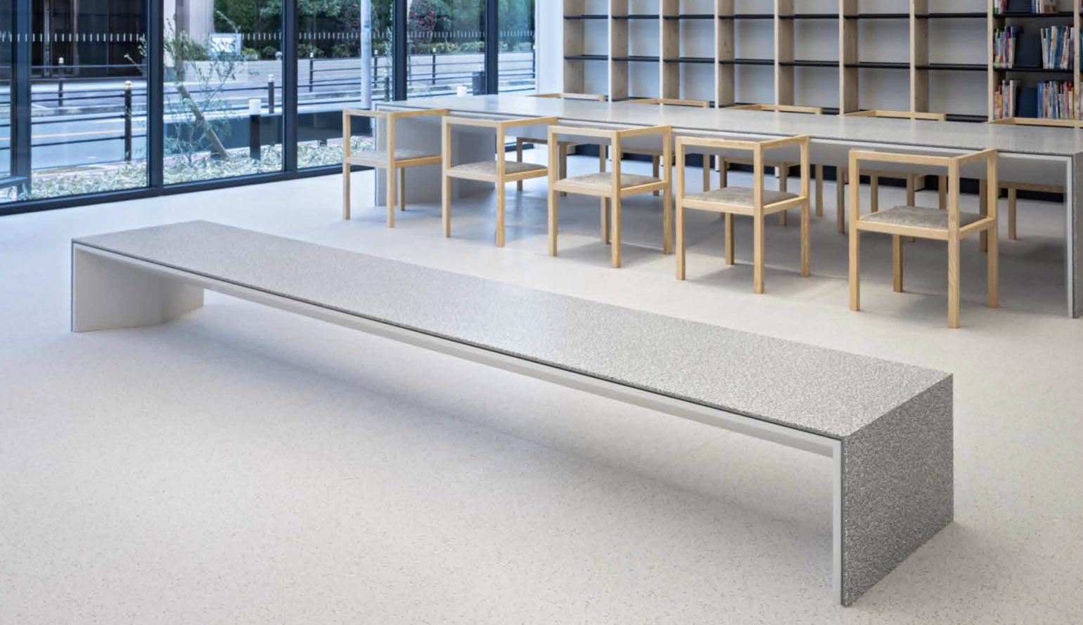 関西医療学園専門学校の新館1階に配置された2つのテーブルのうちの1つ。ライトグレー系のテラゾー調の床に合わせて、テーブルにはコーリアン®「グレイッシュテラゾー」を採用した。