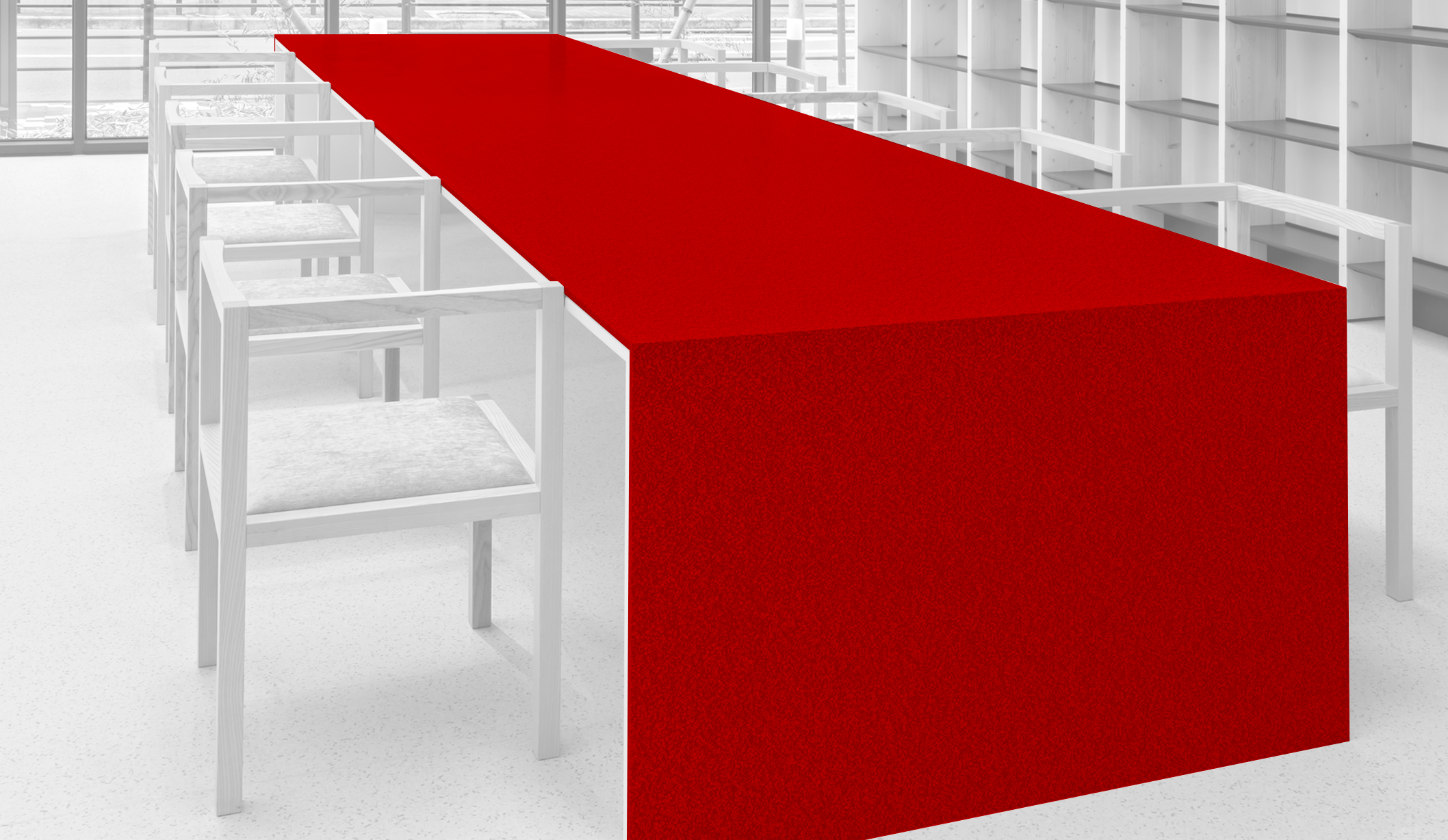 長さ6000㎜、幅1200㎜のテーブルを2台製作。内部にはH型鋼の門型フレームを2列に配し、十分な強度を確保した。また、内部の構造材を鋼板で覆い内側からテーブル全体を支えている。その結果、テーブルの長手方向には脚がなく、天板の接地部は両端の側板のみですっきりとしたデザインになっている。なお、この椅子のデザインは株式会社チェリアの家具デザイナーによって特別に製作されたものだ。座面の生地は、テーブルと調和するグレーの色調が選択され、ひじ掛け部分は、洗練されたスマートで美しいフォルムだ。そのひじ掛けとテーブルの高さがピッタリと合っていて、テーブル2台と椅子20脚が揃う全景を少し離れてみると、そのスリムな見付により、ロビーの空間をより広く感じることができる。
