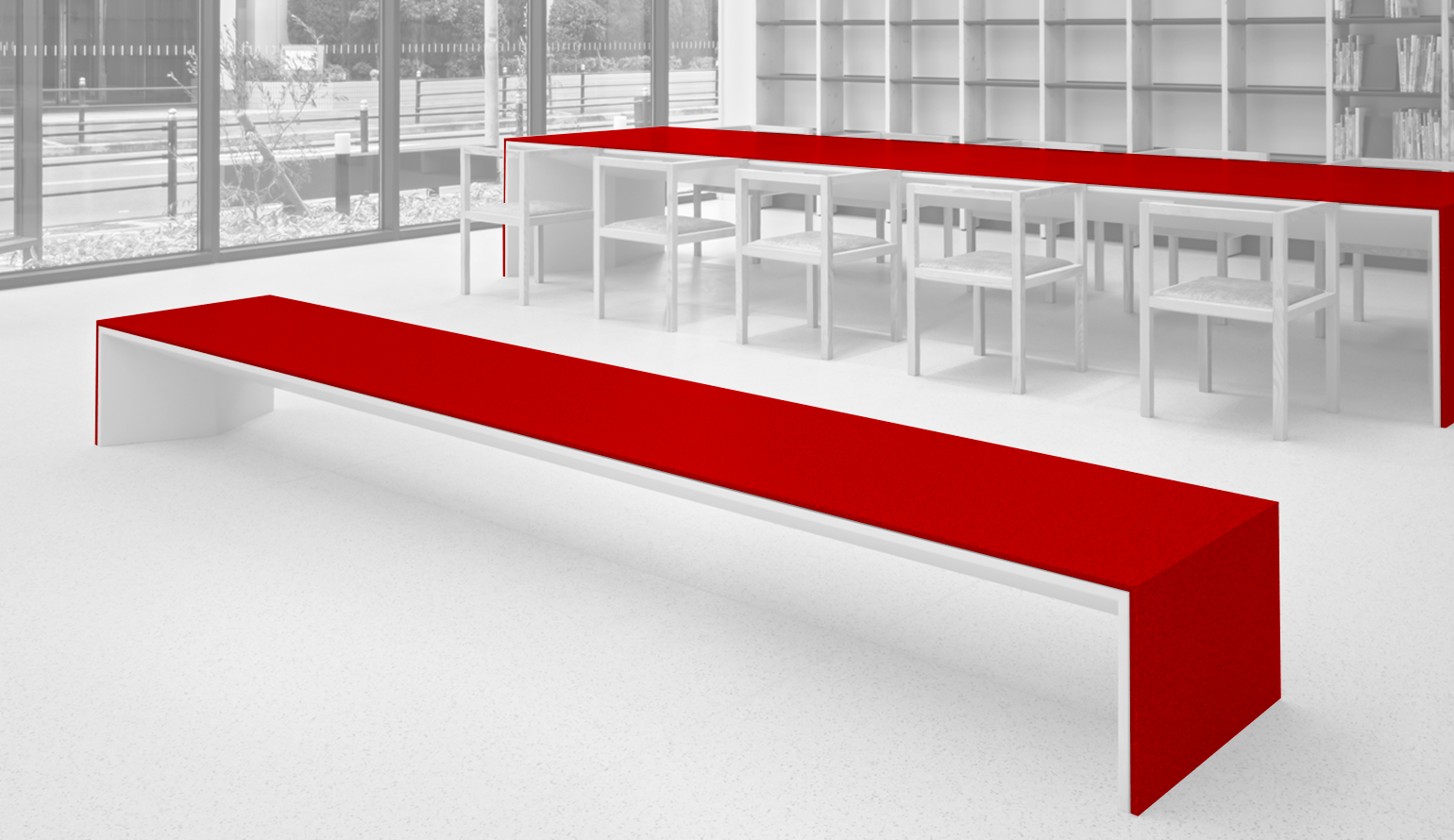 テーブル近くにはテーブルと同じ設計のベンチを配置することで、より空間全体にまとまりが生まれた。