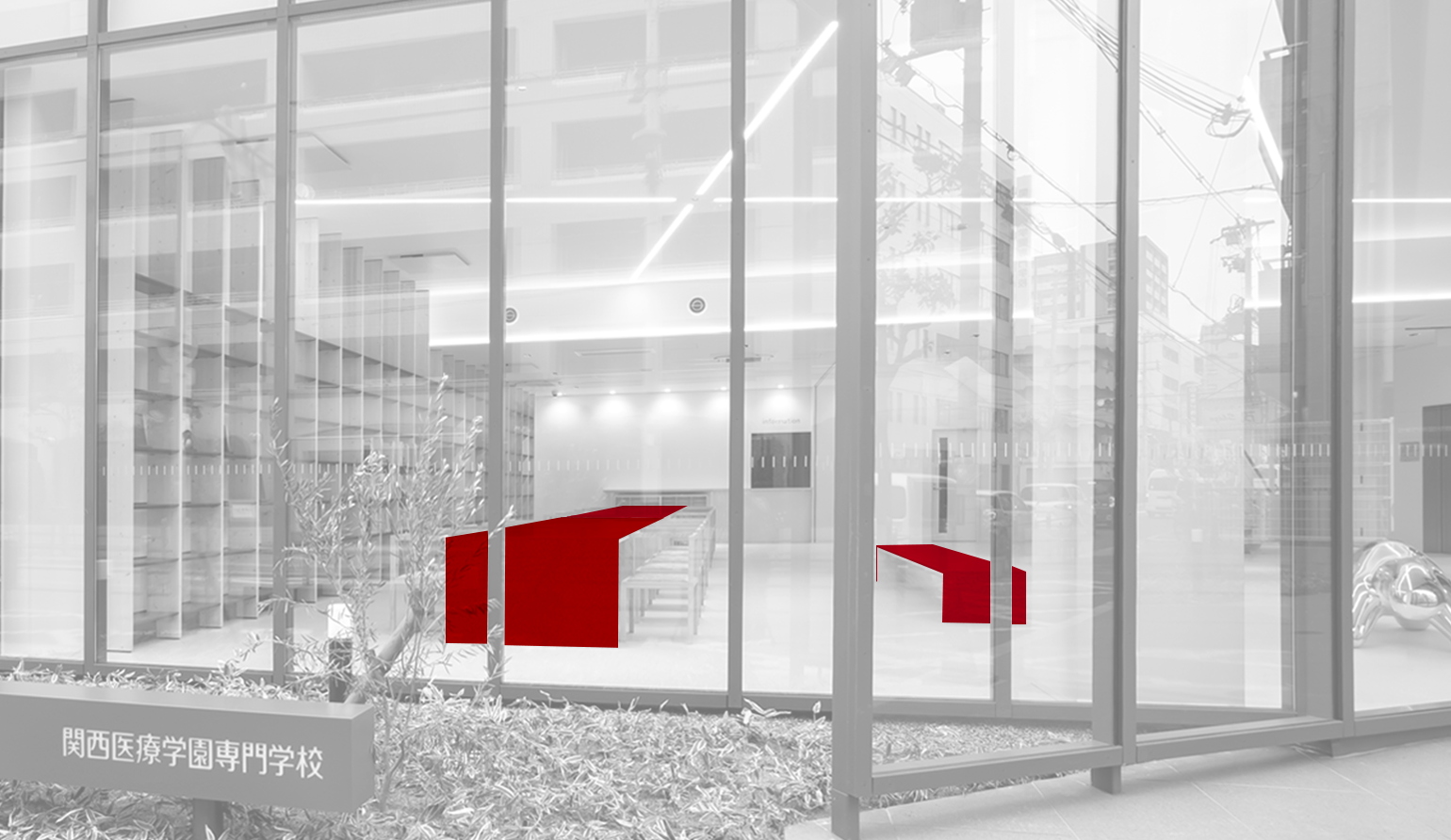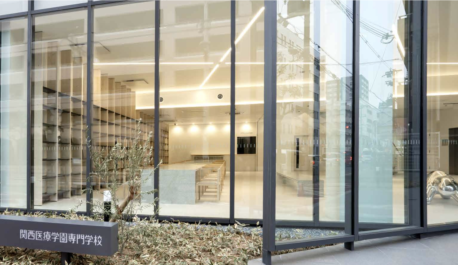 大阪市住吉区にある創立65年を迎えた理学療法士・柔道整復師・鍼灸師など医療従事者を養成する関西医療学園専門学校は2022年4月の歯科衛生士学科開設に併せて、新校舎を建設した。天井高をあげた開放的なデザインのガラスファサード越しに見えるのは、左の壁一面の本棚、そしてテラゾー柄で統一されたベンチとテーブルが整然と並ぶ、清潔感あふれる空間だ。