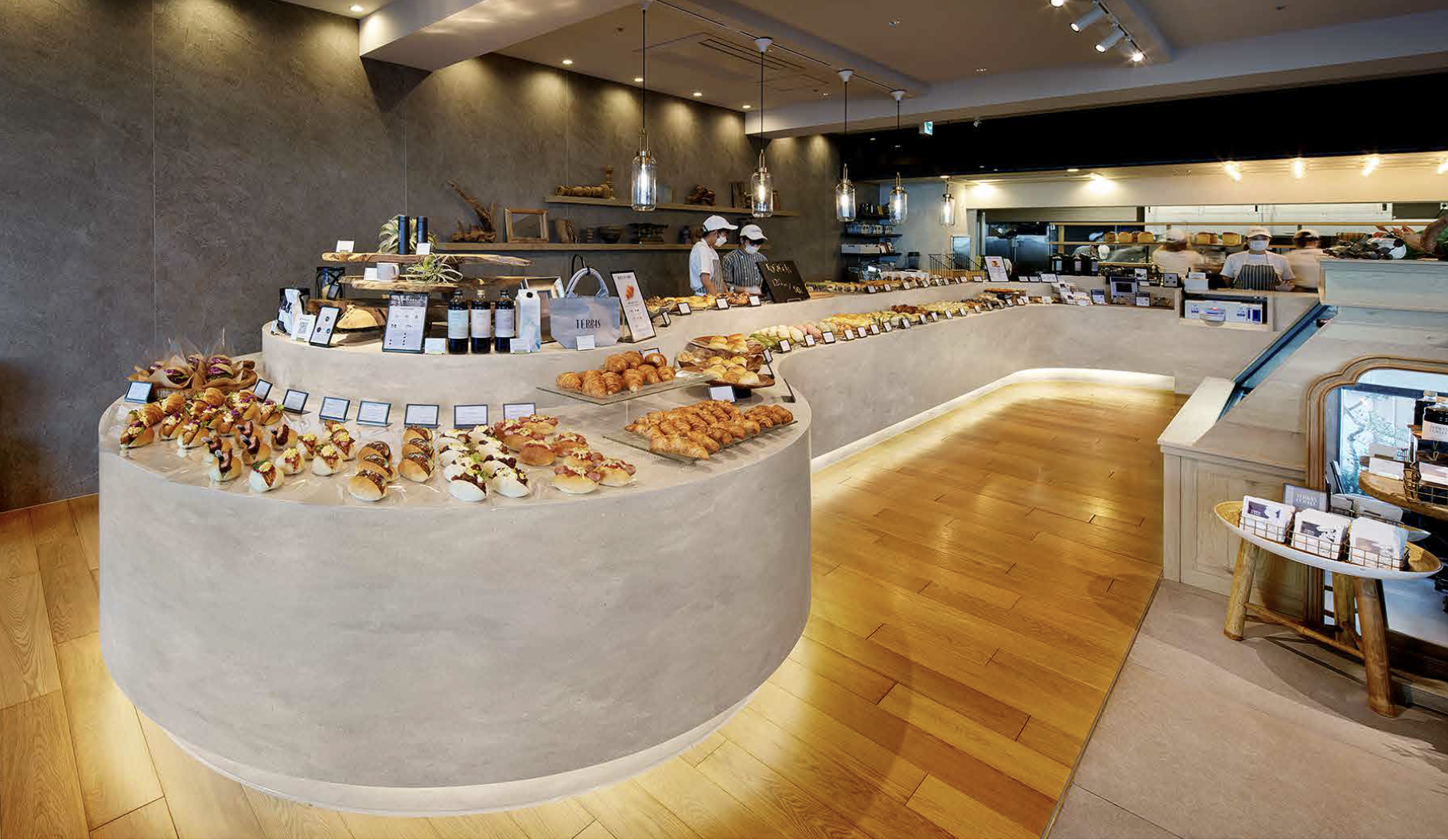 通りに面した二面のワイドなガラス窓から光が明るく差し込む開放的な店内は、モルタル調のタイル床と木の温もりを感じるフローリングが調和し、大地を思わせる石模様の壁や艶めく照明と相まって、素朴な雰囲気の中にグレード感と気品が漂う。店舗デザインを手掛けたプランニングワーク株式会社の松井友樹氏はこう語る。「目指したのはお客様の気分が上がるようなパン屋さんです。出屋敷の街のランクを一段階上げるような存在にしたい、というオーナーの要望を受けて、高級・上品・モダンの3つをキーワードにデザインしました」。