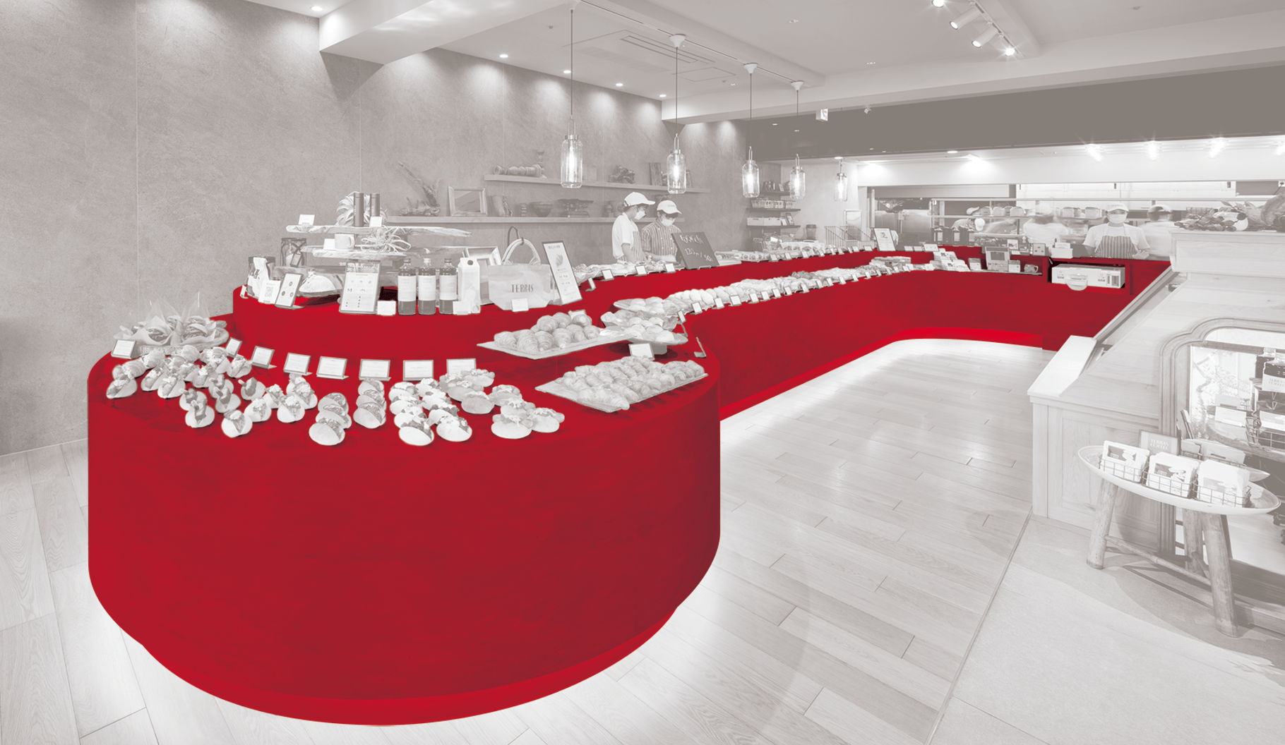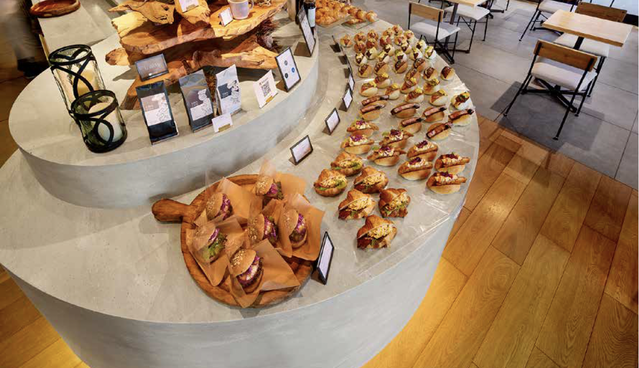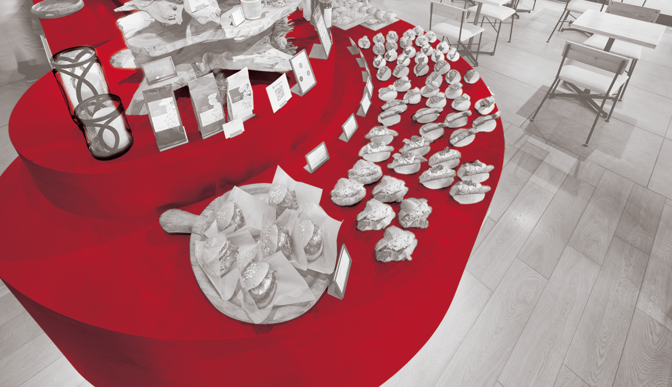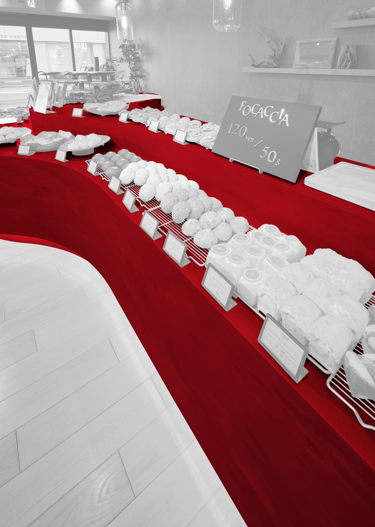 店内に入ると、入口すぐのところから奥へと続くダイナミックな陳列カウンターに惹きつけられる。二段に重なる大きな円型カウンターが変形し、流れるような曲線ラインとなって延びる印象的なデザインだ。底部から放たれる照明の効果で、カウンターはまるで宙に浮いているかのよう。そこに職人の手で焼き上げられた多種多様なパンが、手作りのアート作品のように美しく並べられている。