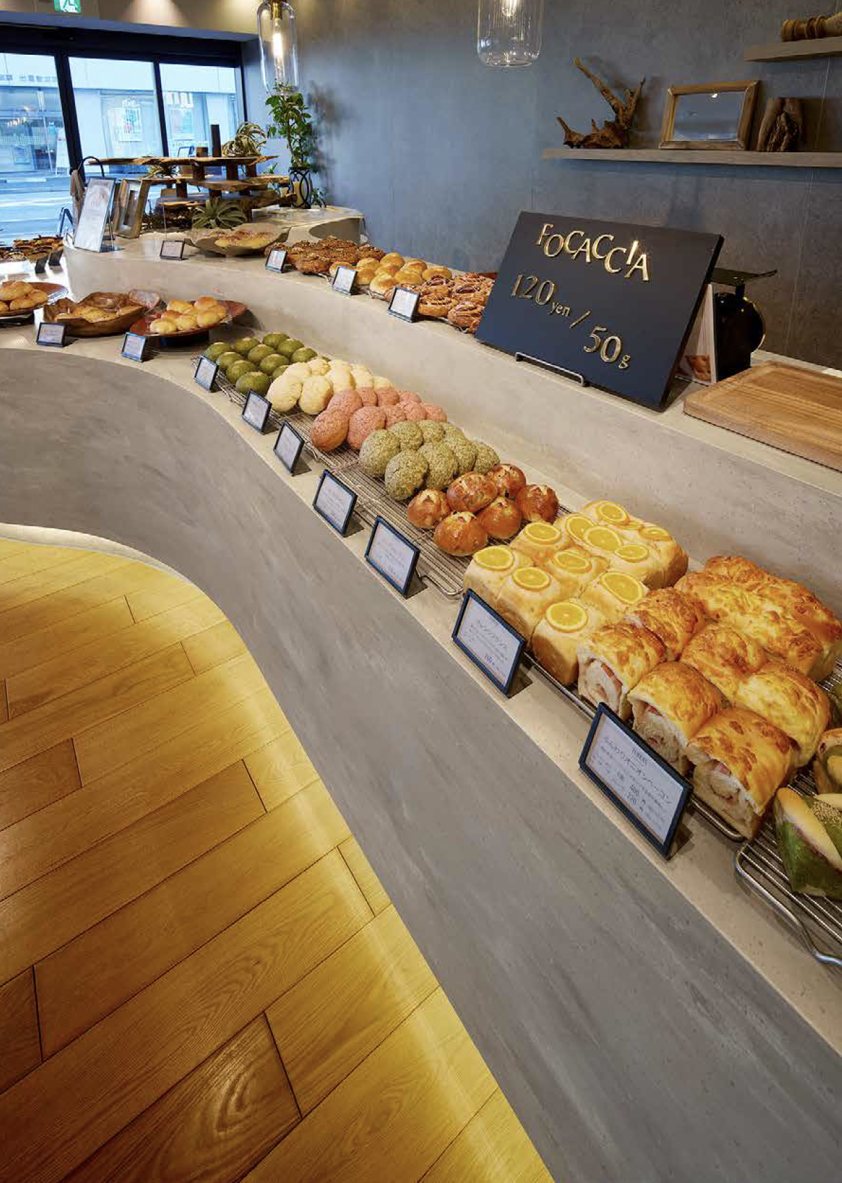 「間口が狭くて奥行きのあるスペースを生かすため、あえて窓側ではなく、店内を縦に貫くように前から奥へとつながる形で陳列カウンターを配置しました。大きな円形カウンターと、そこに並べられた魅惑的なパンがアイポイントになってお客様の目を引きつけ、そこから切れ目なく続く陳列でさらに好奇心をそそり、自然にレジ方向へと誘引する動線になっています」と松井氏。全長9メートル以上もあるこのカウンターは