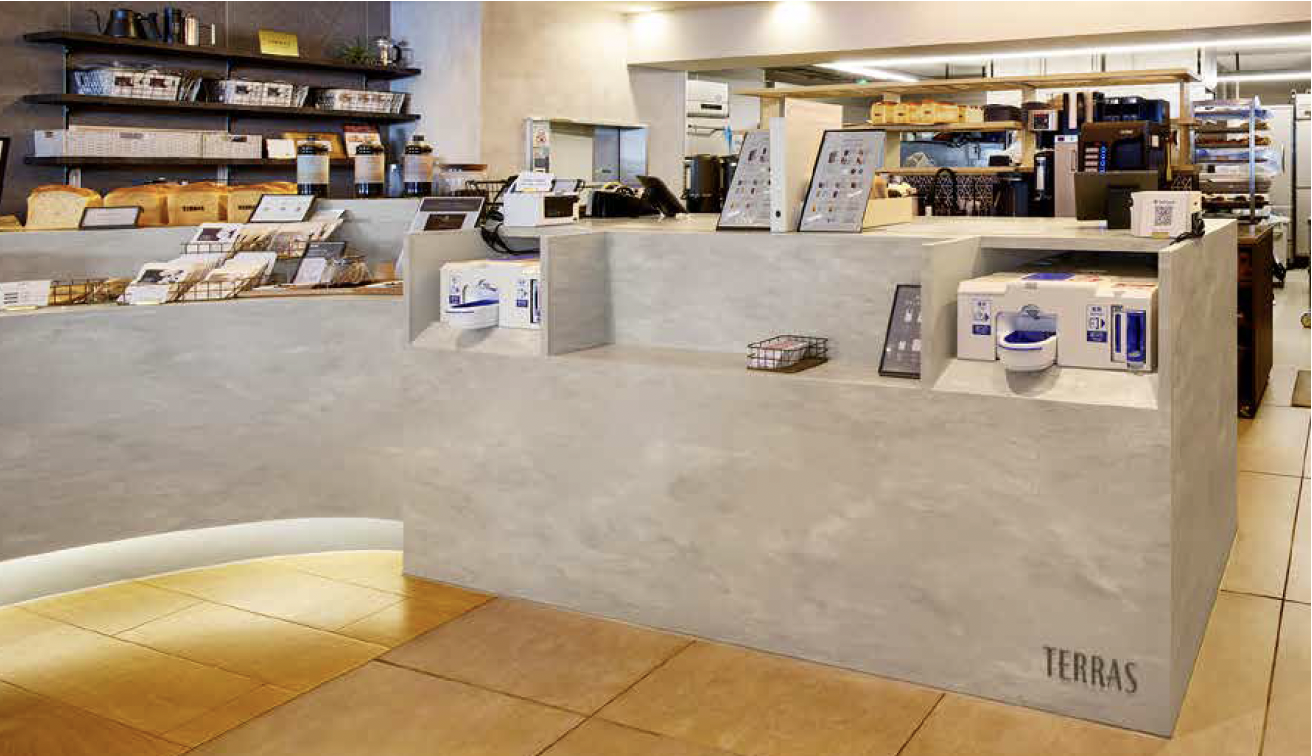 「無機質なおしゃれ感を出したかったのでモルタルで仕上げることも考えたのですが、モルタルだと無骨になりすぎて『TERRAS BAKERY』のイメージに合いません。その点、