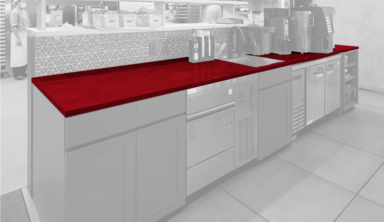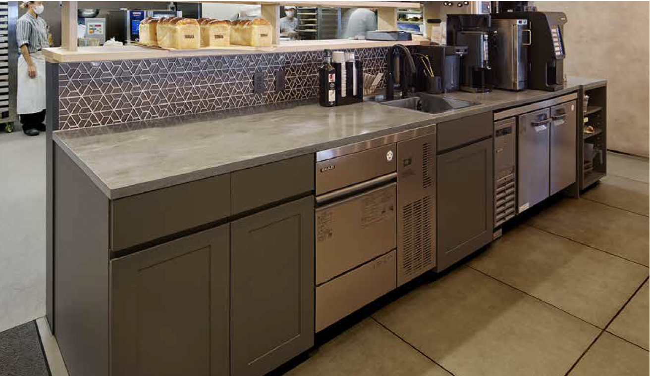 レジ裏の冷蔵庫をビルトインしたカウンターの天板には、ブラウン系の