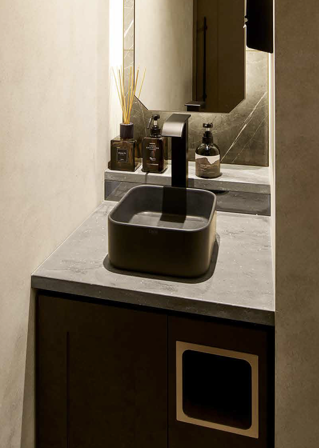 ホテルライクでシックな内装のトイレ。手洗いカウンターには