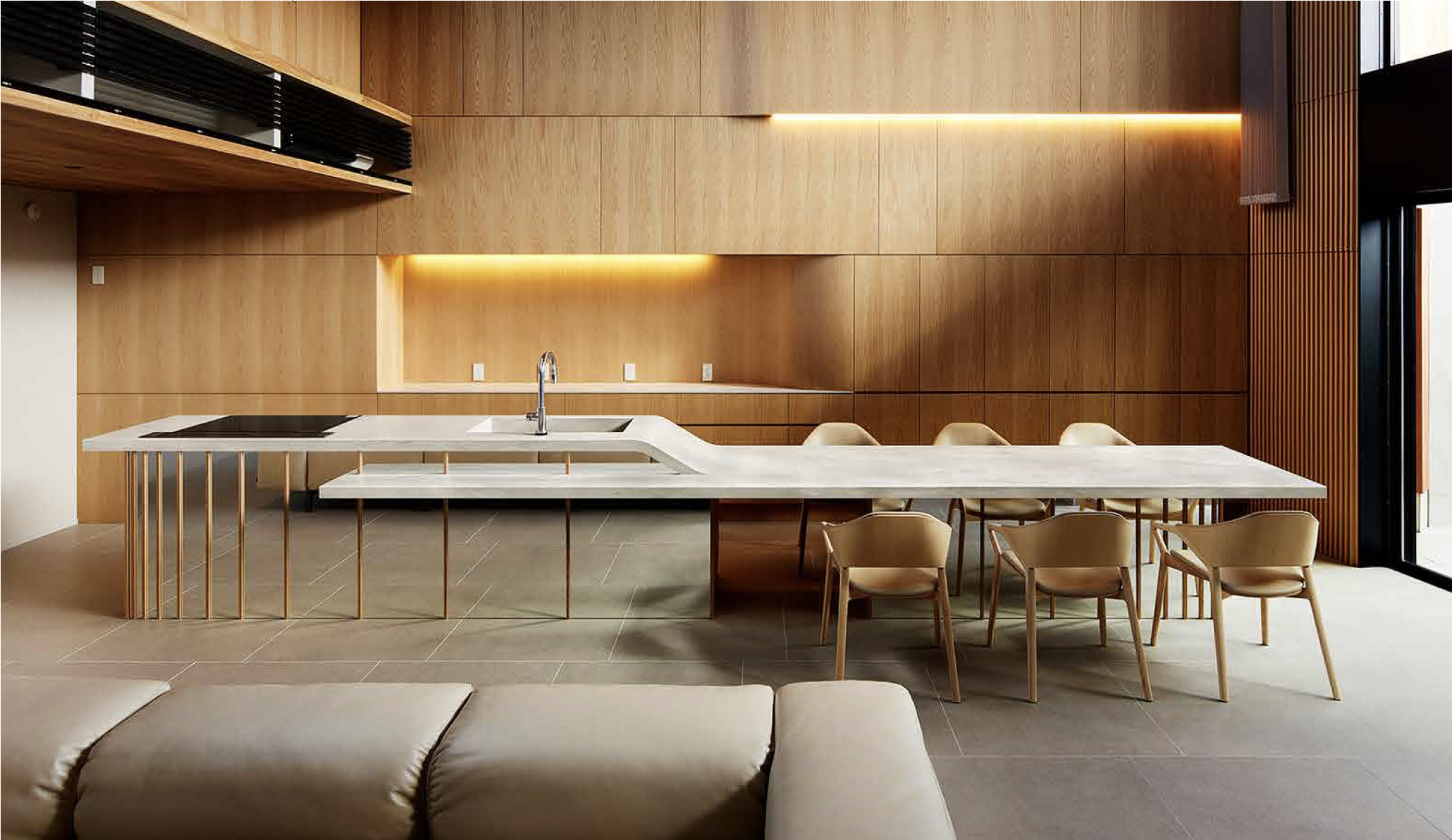 滑らかで繊細なカーブで“調理の場”と“食事の場”の境目を曖昧にしたデザインのキッチン。家事を担当する人の作業をスムーズにするだけでなく、家族が作業を手伝いやすくすることも狙いのひとつ。キッチンとダイニングテーブルはセパレートすることができる設計で、シーンに合わせてテーブルの位置を変えることも可能だ。