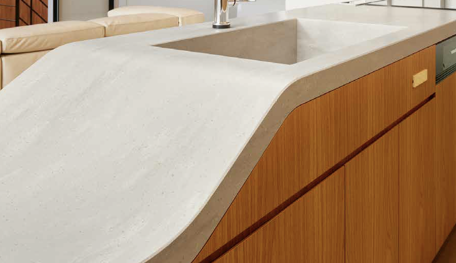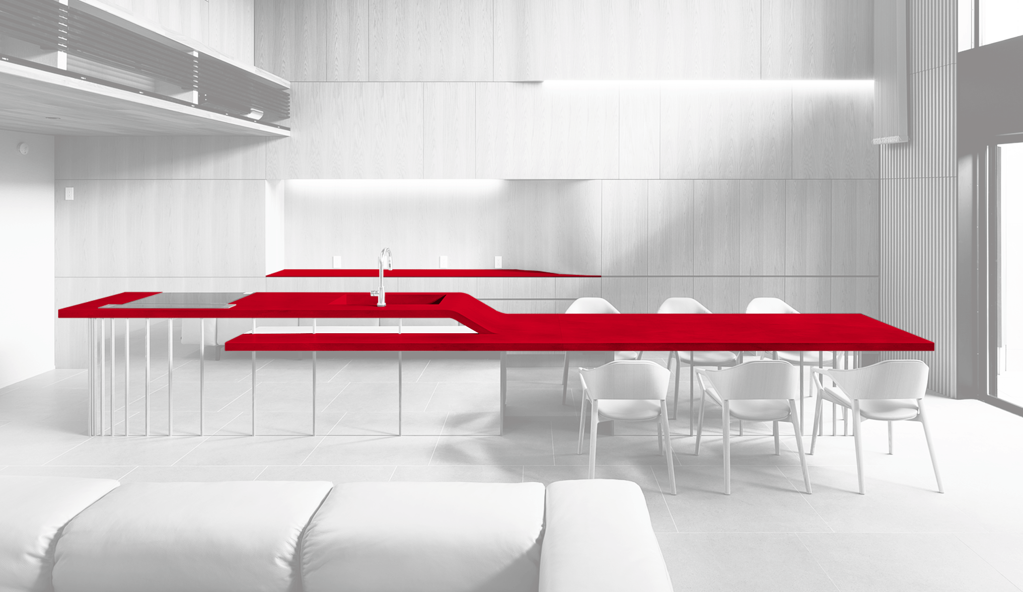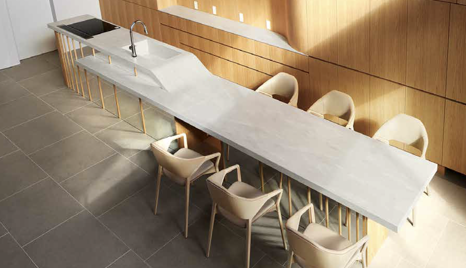 そこで生まれたのが、アイランドキッチンからダイニングテーブルまで、一枚板のようにワークトップがつながるデザイン。滑らかな傾斜を描くワークトップはコーリアン®︎で製作された。