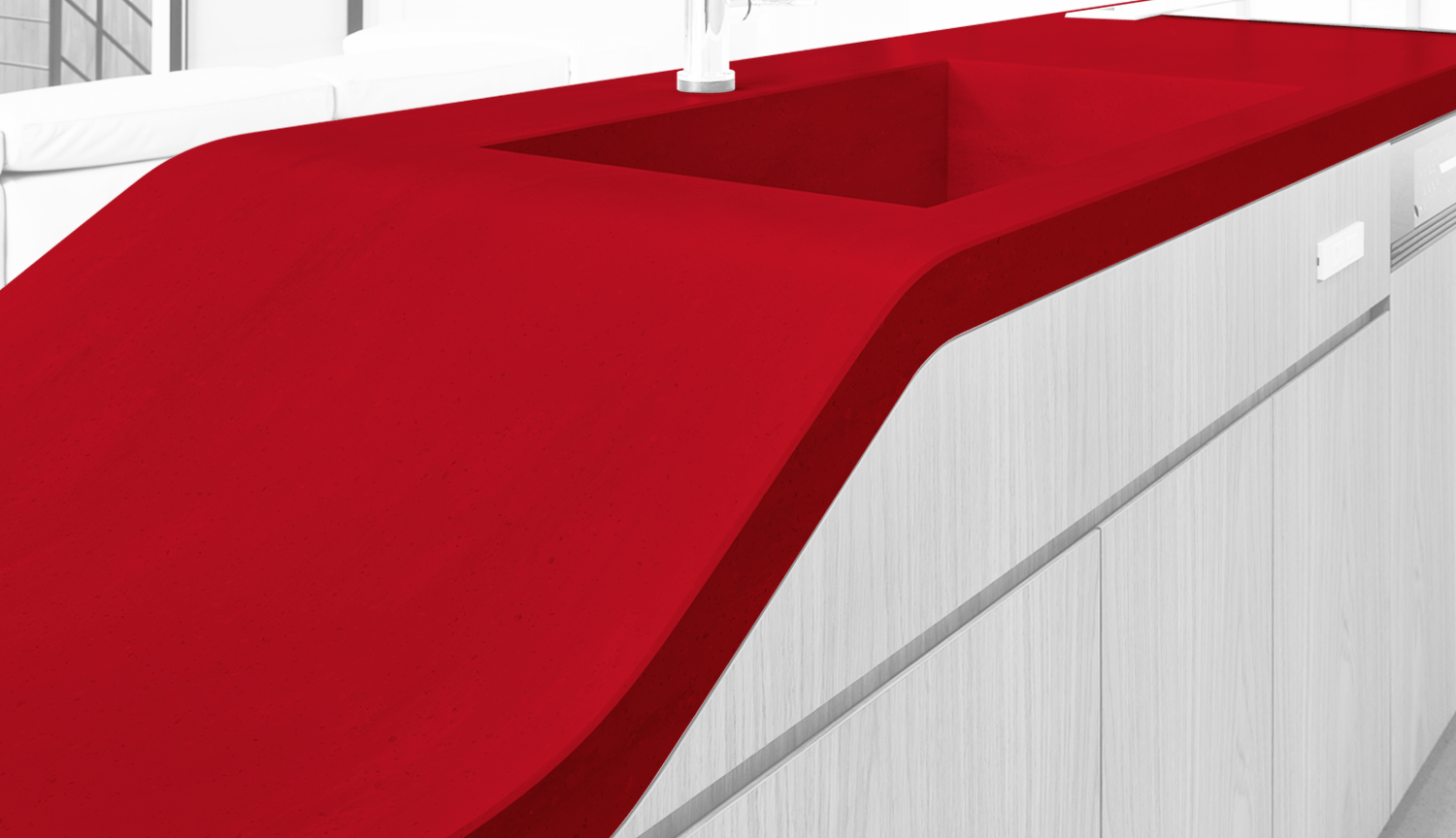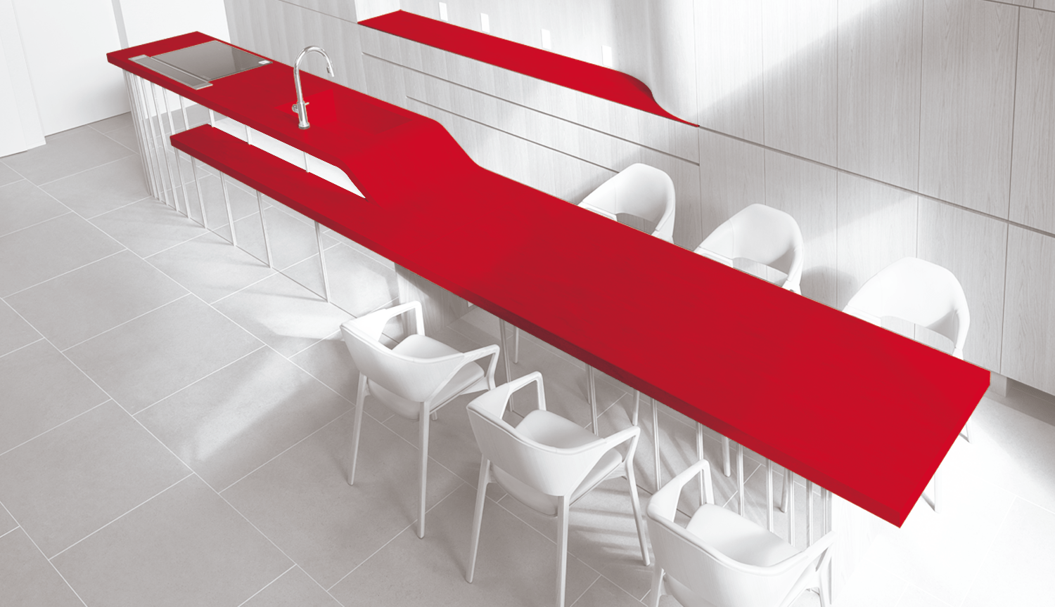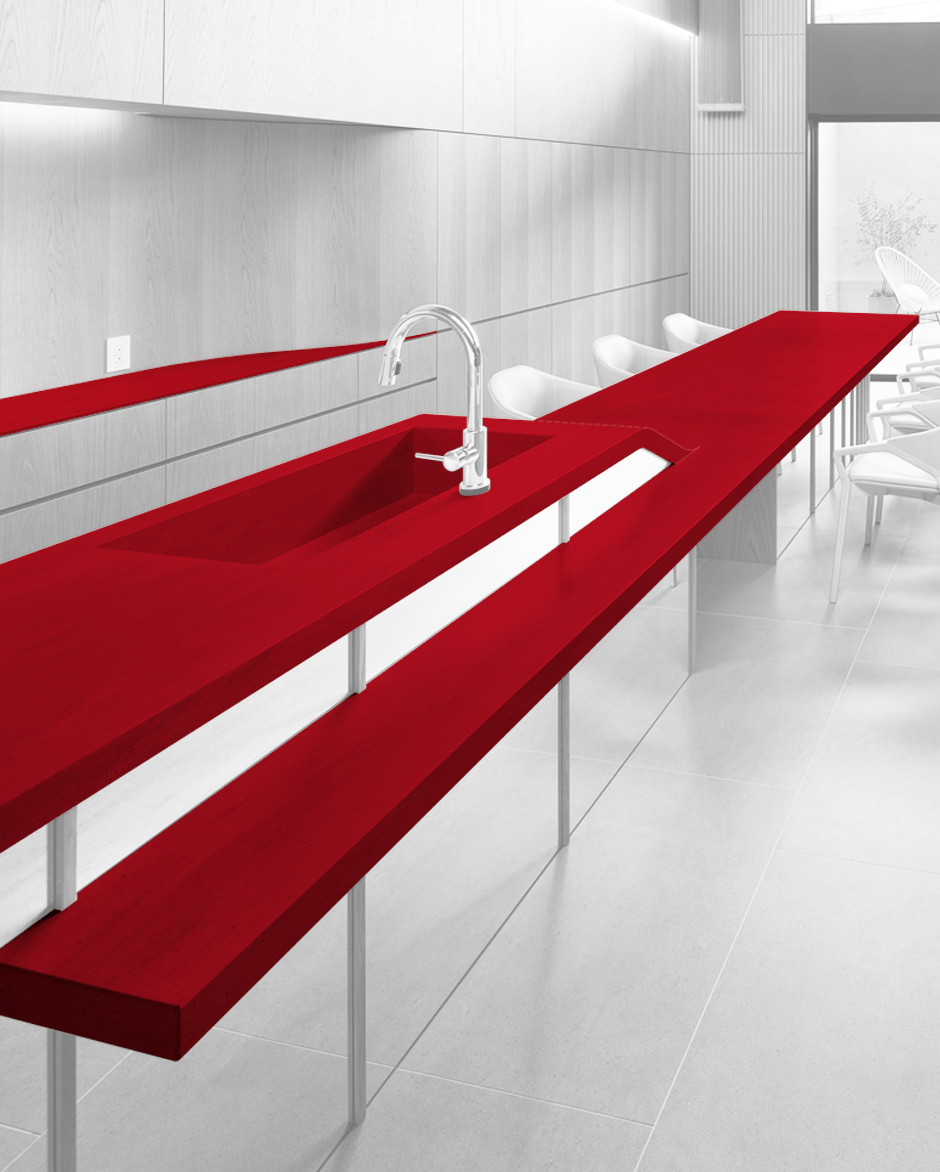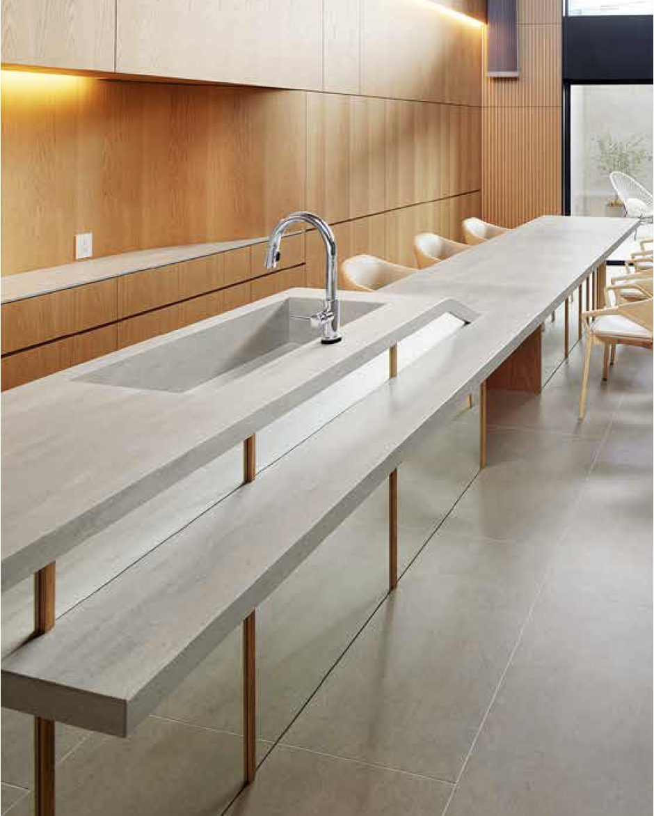 そこで生まれたのが、アイランドキッチンからダイニングテーブルまで、一枚板のようにワークトップがつながるデザイン。滑らかな傾斜を描くワークトップはコーリアン®︎で製作された。