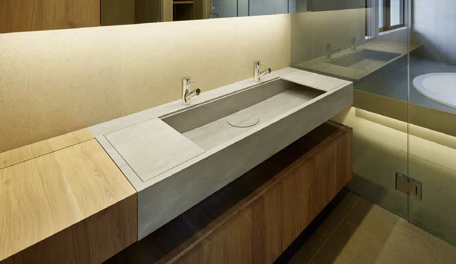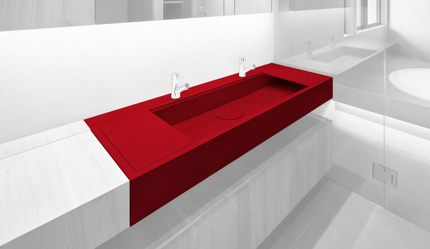 水栓が二つ並んだ洗面化粧台。ワイドなボウルの左右にある可動式の板は、身支度に必要な小物などの一時置きとして、好きな場所で使うことができる。コーリアン®︎の加工性のよさを活かして排水口の蓋も同色で製作。