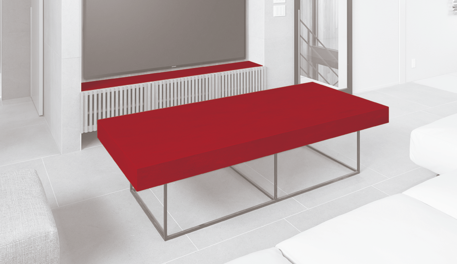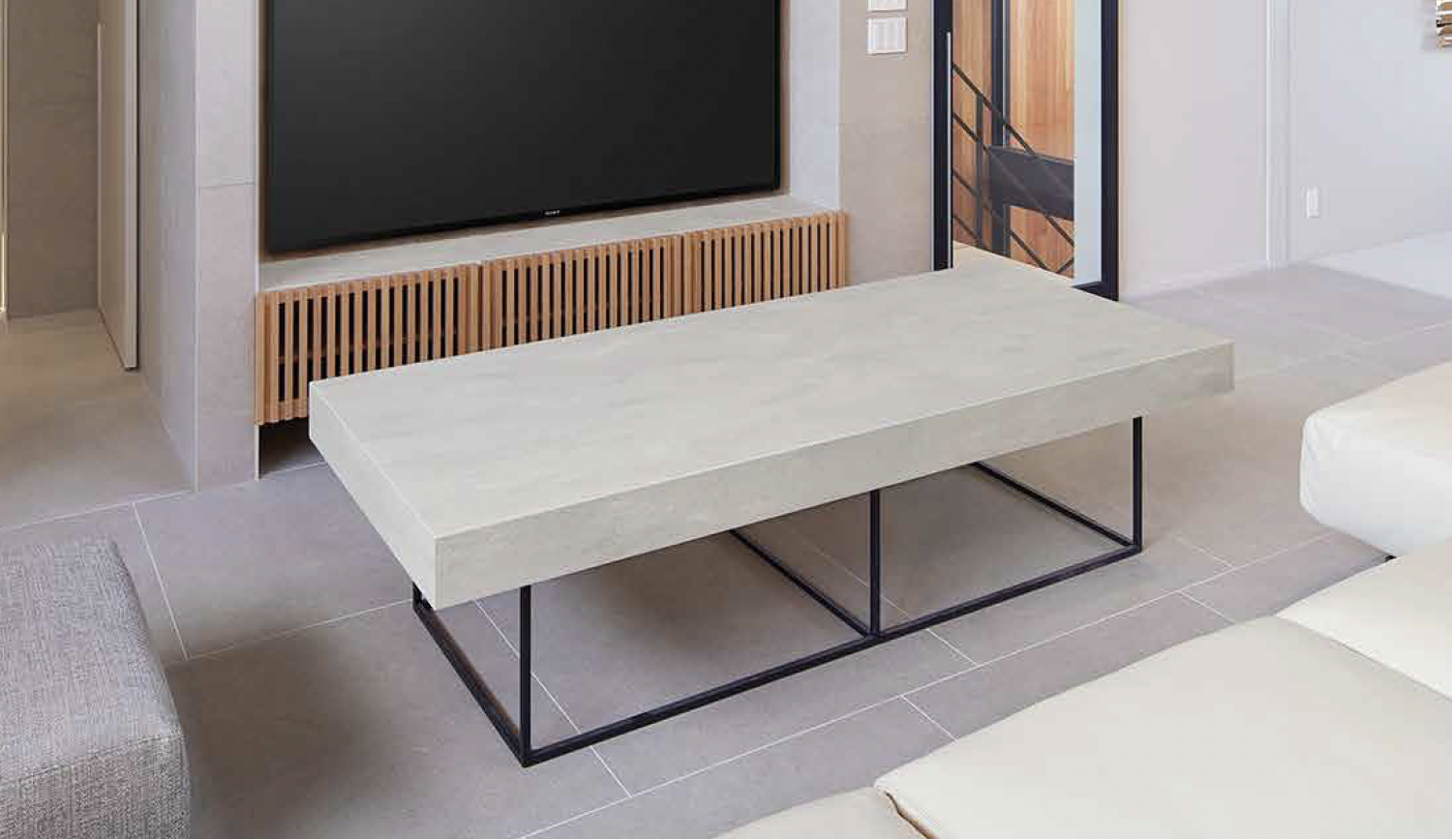リビングテーブルもキッチンと同じコーリアン®︎「ニュートラルアグリゲート」で製作。空間全体で使用する素材や色味の数を最小限に抑えることでミニマルな印象を作り出している。