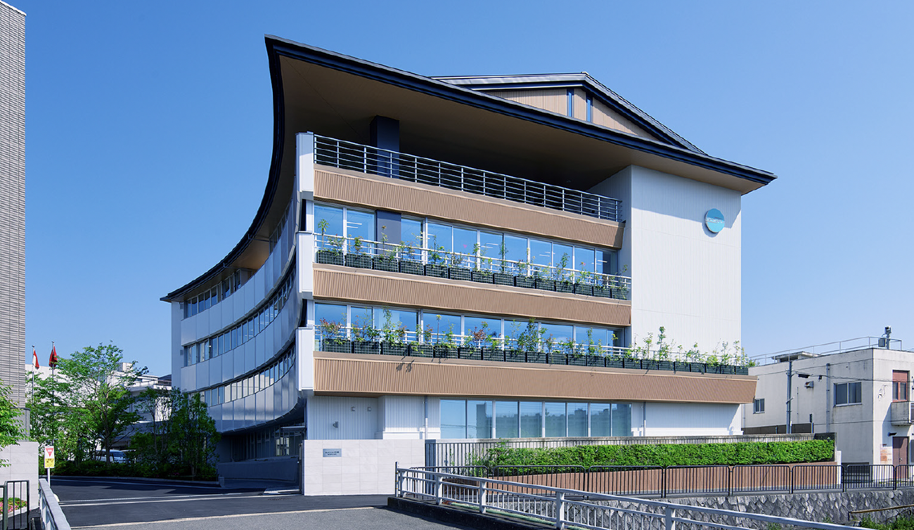 京都市東山区の疏水沿いにある、寺院を思わせるユニークなデザインの建物。歯科材料や歯科用機器の開発・製造・販売を手掛ける総合メーカー、松風の新社屋「あゆみテラス」だ。松風は1922年の創業以来、数々の「日本初」、「世界初」となる歯科医療製品を送り出してきた。現在では人工歯や研削・研磨材分野で国内トップシェアを誇り、欧州・北米・南米・アジアなど130カ国以上に製品を提供している。