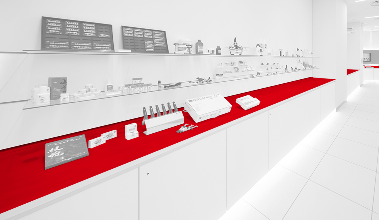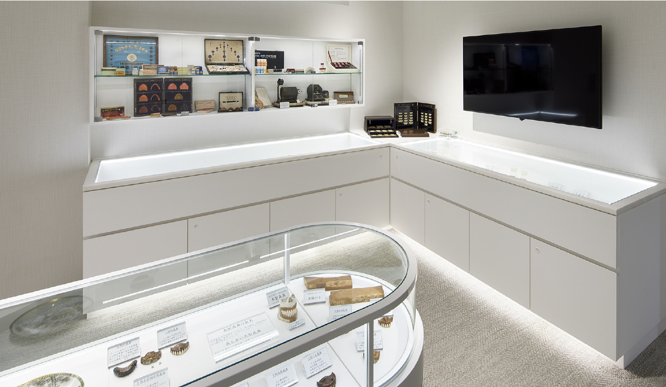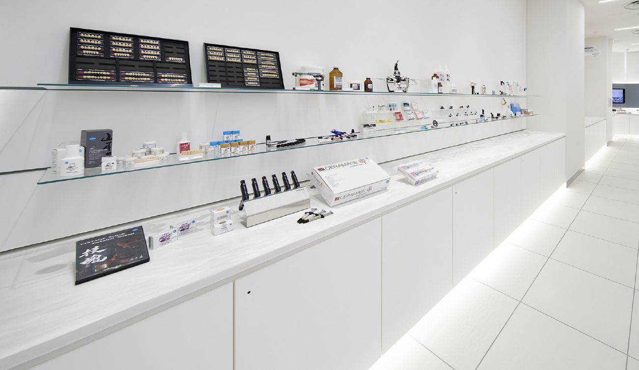 「あゆみテラス」のエントランスへ入ると、光に彩られた白のスタイリッシュな空間が広がっている。正面には歯をイメージした造形壁があり、床と天井から突き出したような格子の曲面がアクセントとなっている。壁一面に沿って造り付けられた什器には人工歯や診療・技工材料、セルフケア製品などが整然とディスプレイされ、それらを眺めつつ足を進めると自然に楕円状にデザインされた格子壁の向こうに広がる展示スペースへと誘われていく。