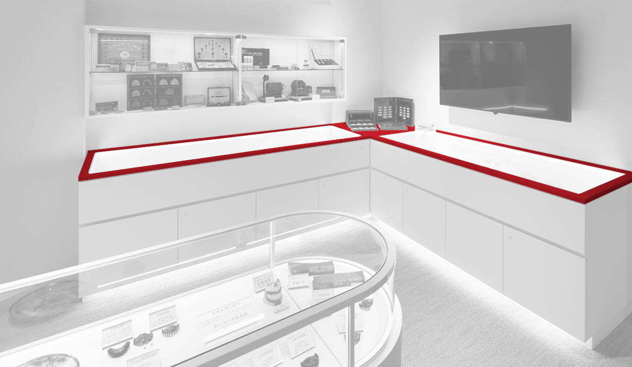 「ショールームは松風様の歴史と最新技術を紹介するおもてなしの場で、いわば企業の顔となるエリアですから、“清潔感のある空間”、“印象に残る空間”、“歴史と最新の融合”の3つをコンセプトに、白と艶感を活かしてデザインしました」と須摩淵氏。什器カウンターに