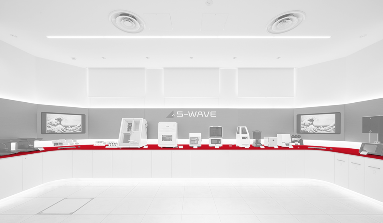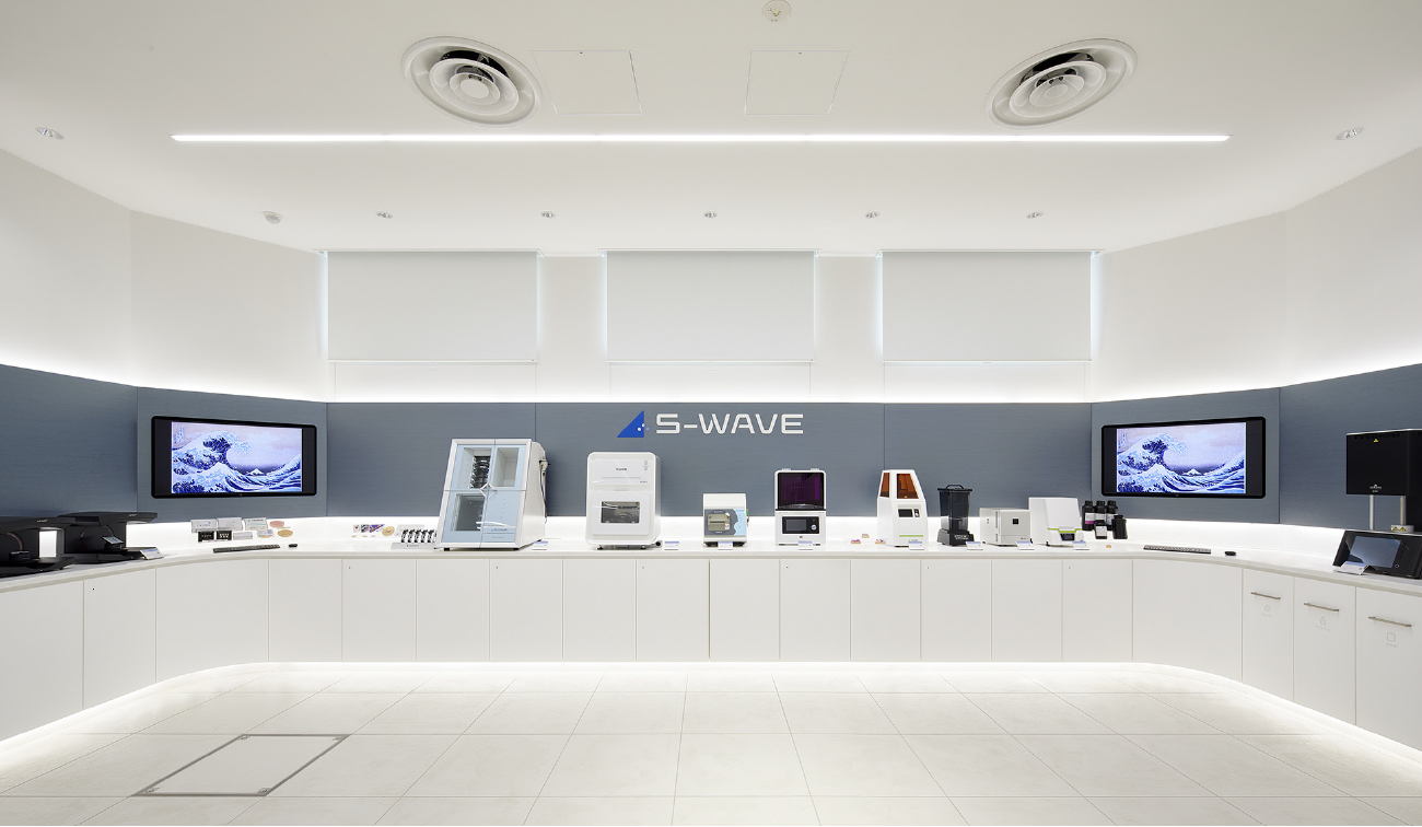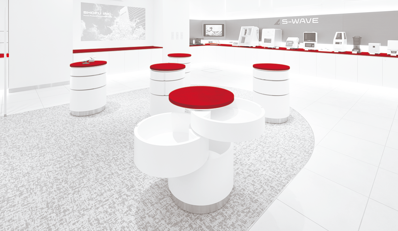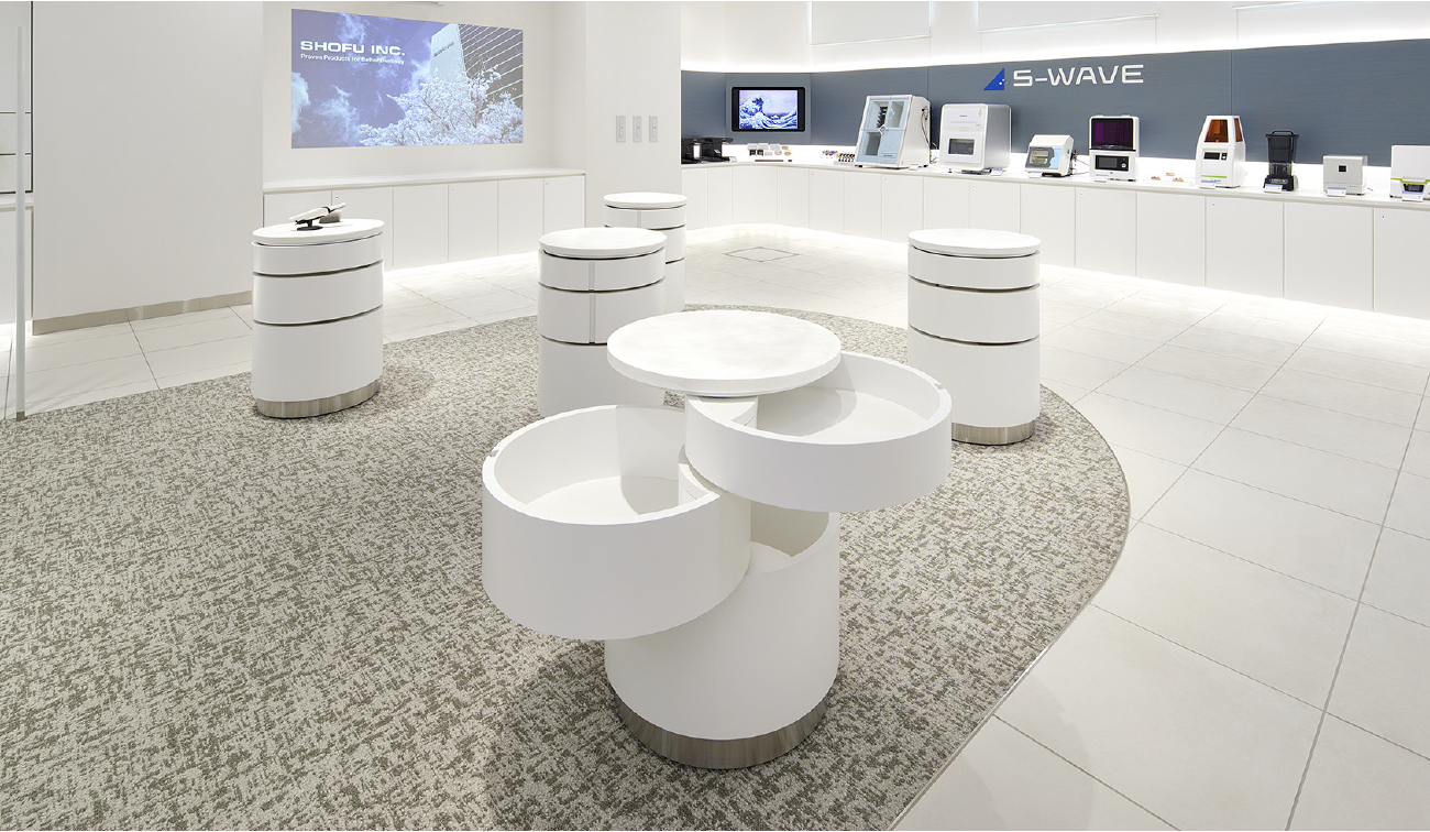 白の世界は変幻自在。イベントの際にはモニターの映像や照明色をカラフルなものに変えることで、華やかな演出ができるのも魅力だ。「主に歯科医療関係の専門家が見学されるのですが、美しくて見やすいアートスペースのようなショールームにみなさん感動してくださいます」と顔をほころばせる営業部の岩切信也氏。訪れた人の印象に残る空間デザインが、『SHOFU』ブランドのさらなるイメージアップに大きく貢献しているようだ。