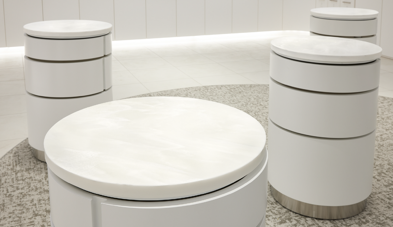「板状の素材でありながら曲線的なデザインが可能ですし、シームレス加工でジョイント部の継ぎ目がほとんど目立たない仕上がりにできることも採用の決め手でした。白のミニマムな空間の中に少し硬質な雰囲気を取り入れたかったので、その点でも