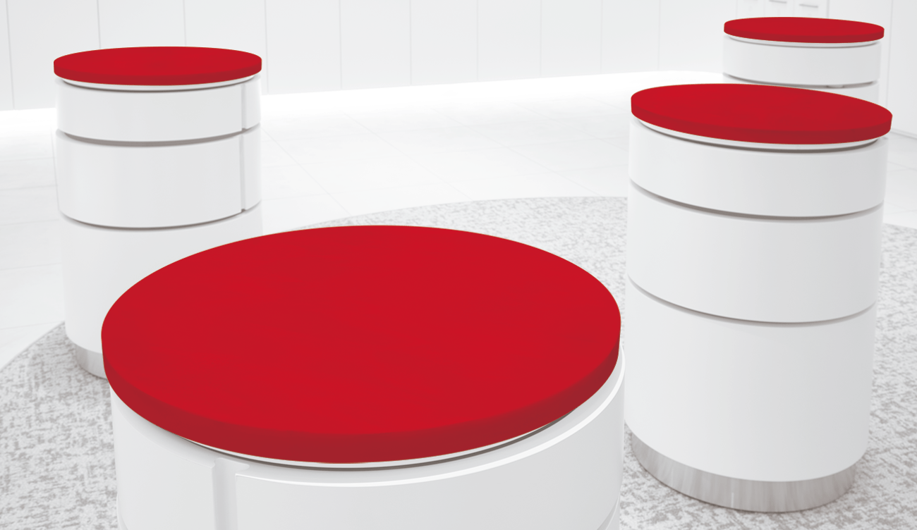 その格子壁の内側は歯科クリニックの診療室のようなしつらえで、メインとなる奥の什器カウンターには同社の注力製品であるCAD/CAMシステム機器が展示されている。こうした壁面什器のカウンターや、点在するタワー型の円形トレー什器、曲がり壁に沿ったPCカウンターなどに