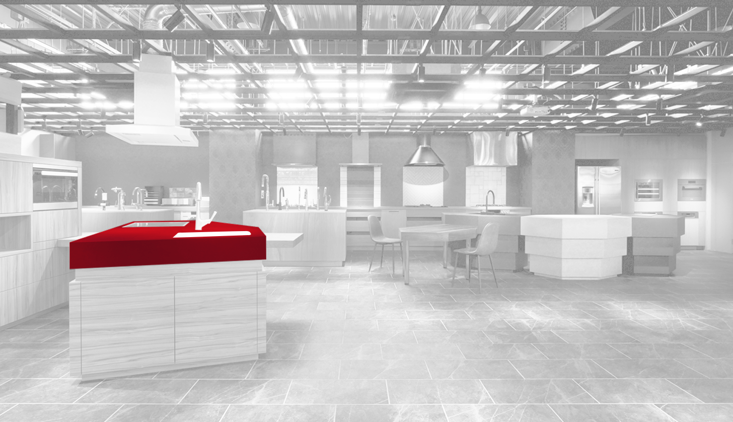 NOKKIのキッチンエリア。さまざまなオーダーメイドキッチンとキッチン設備が展示されている。