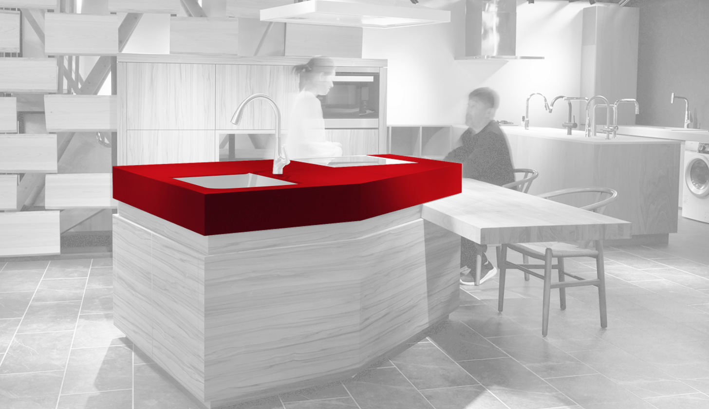 コーリアン®を選んだ理由について、「厚みのある天板を五角形に美しく創作するには、コーリアン®が最適の素材だと判断しました。シームレス接着でまるで一体成型したかのような仕上がりにできて、圧倒的な塊感が出せますから」と答えてくれた。