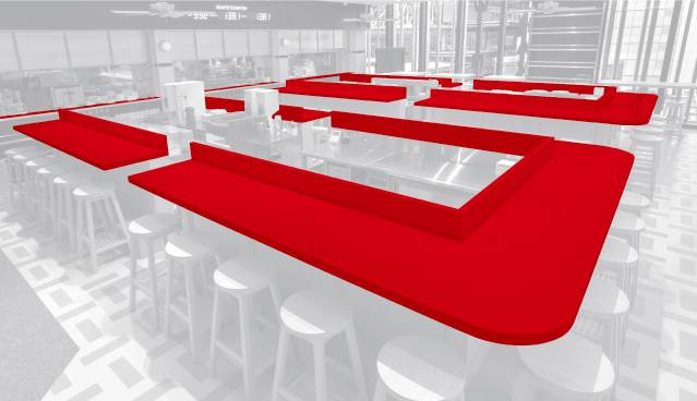 コーリアン®で造作された2つの大きなU字型カウンター。スタッフが内部の厨房に出入りしやすいよう、カウンターの途中を切り離している。