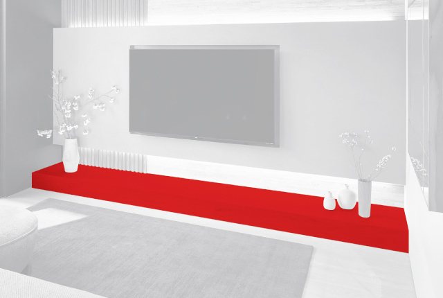 長さ約3,500mmのテレビボードは、コーリアン®の一枚板で造作されたもの。しっとりとした質感が上質のくつろぎ感を醸し出している。