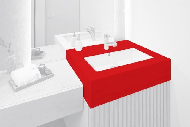 コーリアン®の天板は長さ2,600mm。現場搬入の際には2分割して運び、現場でシームレスジョイントを行ったという。「ジョイントは短時間で完了しました。接合部分が目立たず、滑らかに一体化できるのは、素材としての扱いやすさと加工性の高さゆえですね」と同社デザインチーム課長の村上大輝氏は語る。