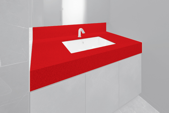 1階のパブリックエリアに設けられた3つのトイレにもコーリアン®の意匠性が活かされている。女子トイレの手洗いカウンターは「アロールートⅡ」。ホワイトベースに青みを帯びた模様が柔らかく浮かび、滑らかさと深みを感じさせる。来客用のトイレに用いられたのは「グレイッシュテラゾー」。落ち着いたグレーをベースに大小の粒が浮かび上がる石目模様で、黒の床タイルとも調和して洗練された印象だ。そして、多目的トイレは「ラバロックⅡ」。グレーや茶が絶妙に混じり合った火山岩を思わせる力強さを感じさせる。