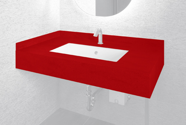 多目的トイレの手洗いカウンターは「ラバロックⅡ」。火山岩を想起させる色柄のコーリアン®に間接照明が柔らかな光を拡散し、重厚感とやさしさを併せ持つ空間を創り出している。