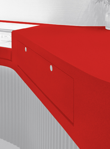 天板から側面、引き出しまでをコーリアン®︎で統一し、ソリッドで洗練された印象に。滑らかなアール形状や一体感のある造形に、コーリアン®︎の高い加工性が活かされている。